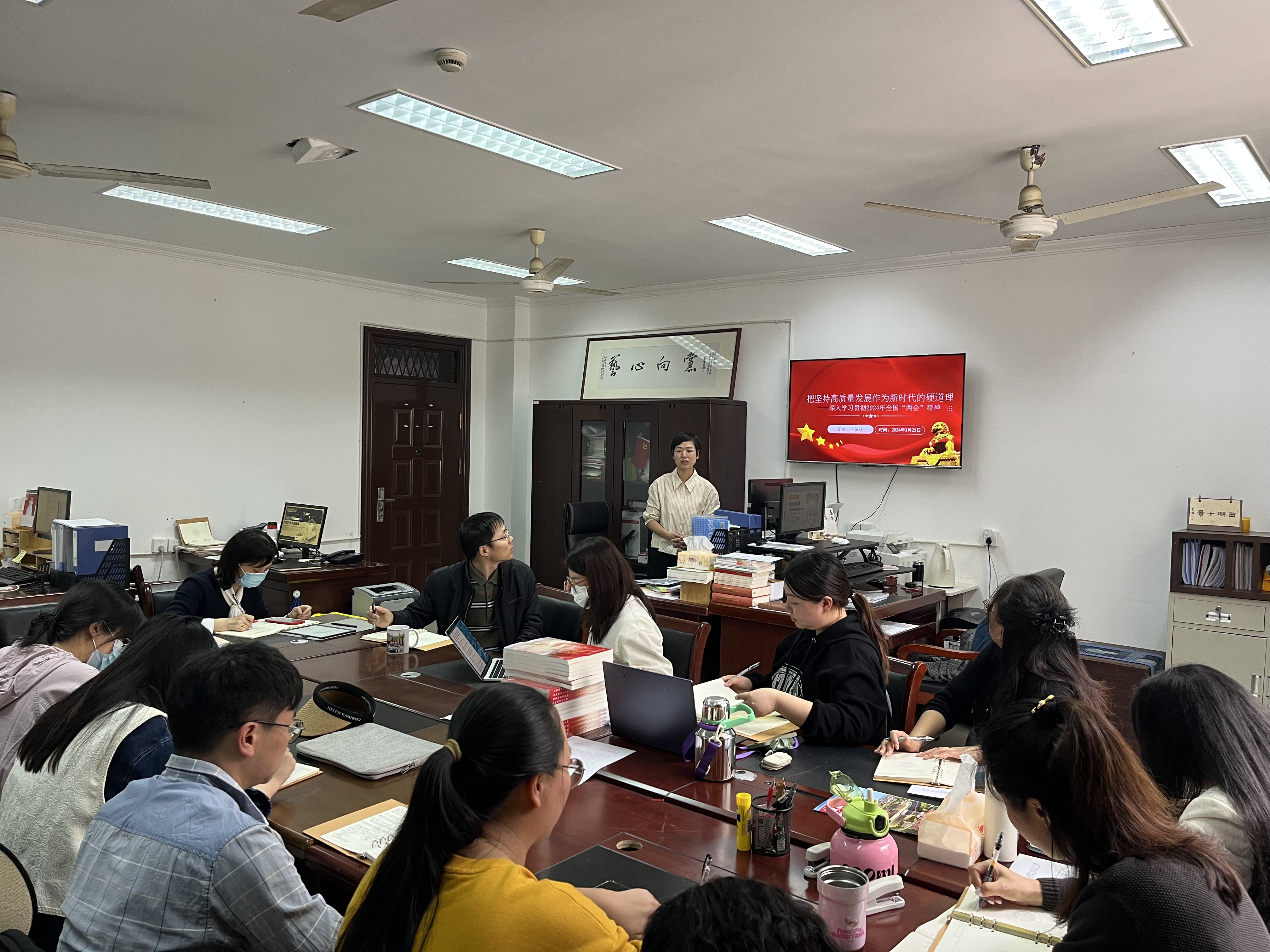 王筱芽领学全国“两会”精神、习近平总书记“两会”金句,传达政府工作报告的主要内容,并作重点发言。这次全国两会是在迎接中华人民共和国成立75周年、实现“十四五”规划目标任务关键之年召开的一次重要会议,也是高举旗帜、求真务实、激发干劲的大会。习近平总书记在全国两会期间发表的一系列重要讲话,就发展新质生产力、推动高质量发展等发表一系列重要讲话。李强总理作政府工作报告,全面总结2023年工作成绩,明确2024年经济社会发展主要预期目标和政策取向,传递了全面向好的预期和信心。深刻领会全国两会会议、政府工作报告精神,深刻把握全省“新春第一会”聚焦“人”的内在逻辑,聚焦省委“三支队伍”建设要求,牢固树立“大人才观”,推动马院切实扛起为党育人、为国育才的重要使命,坚持以改革为动力、以创新谋发展,展现浙艺马院的责任担当。