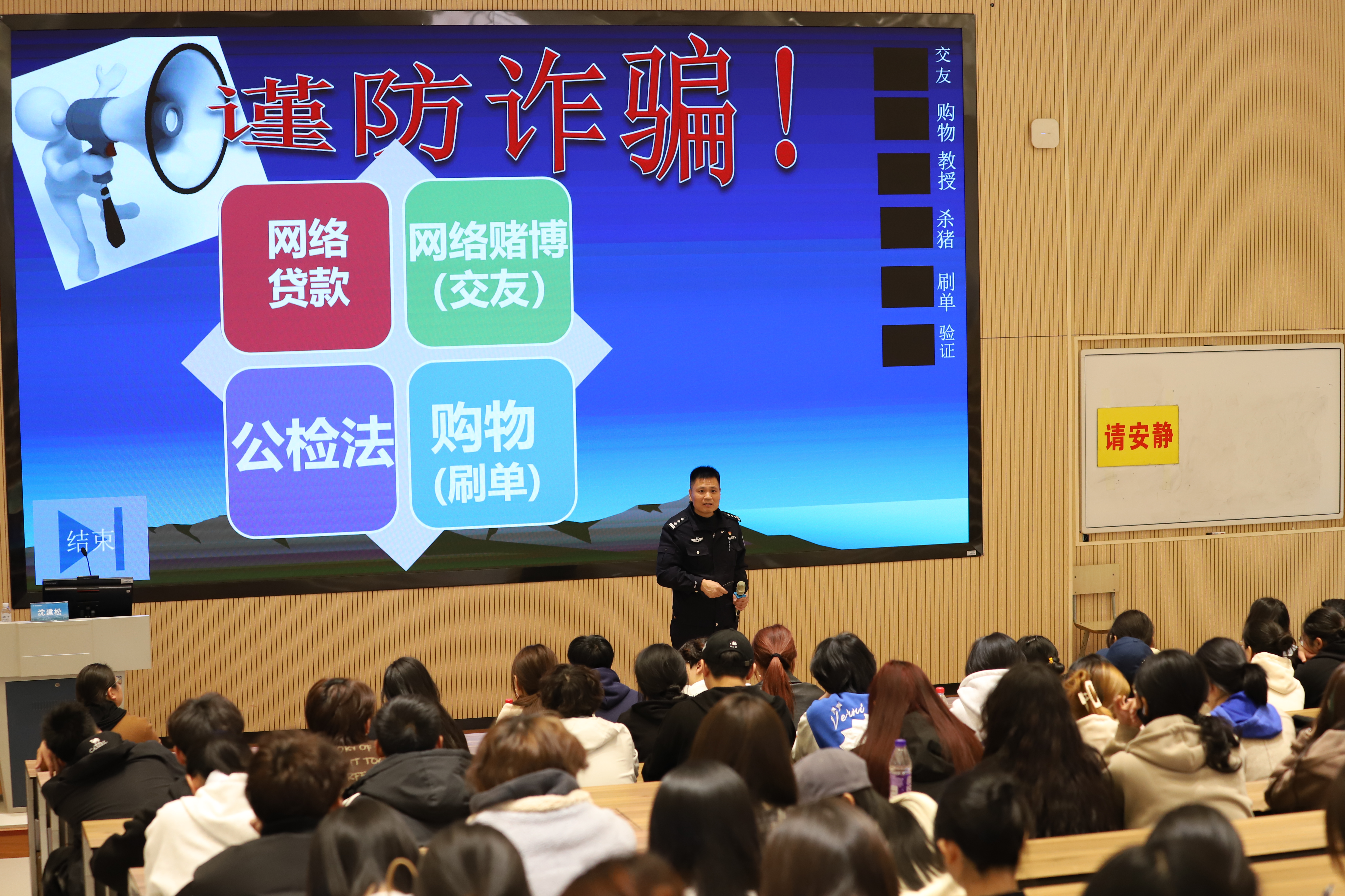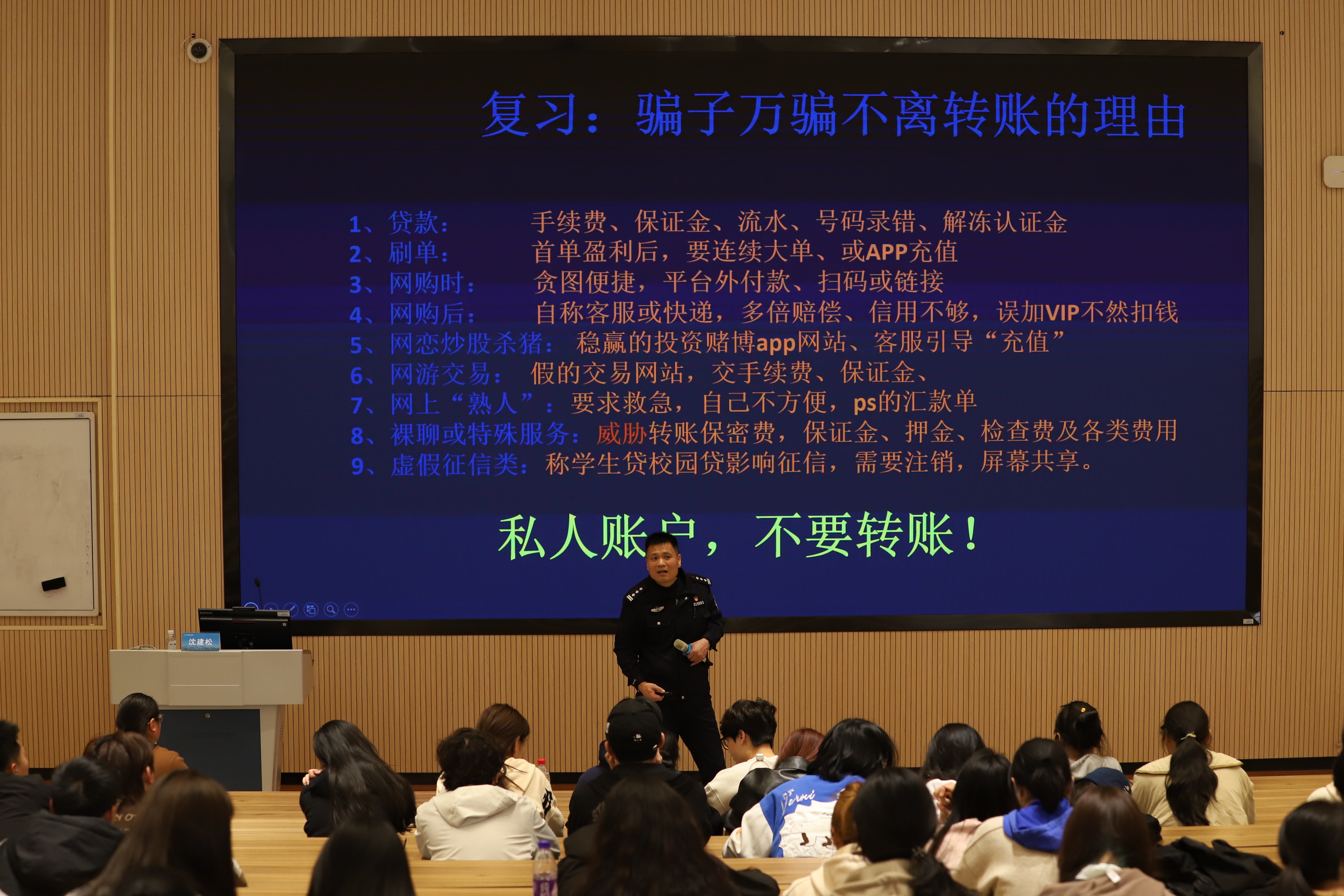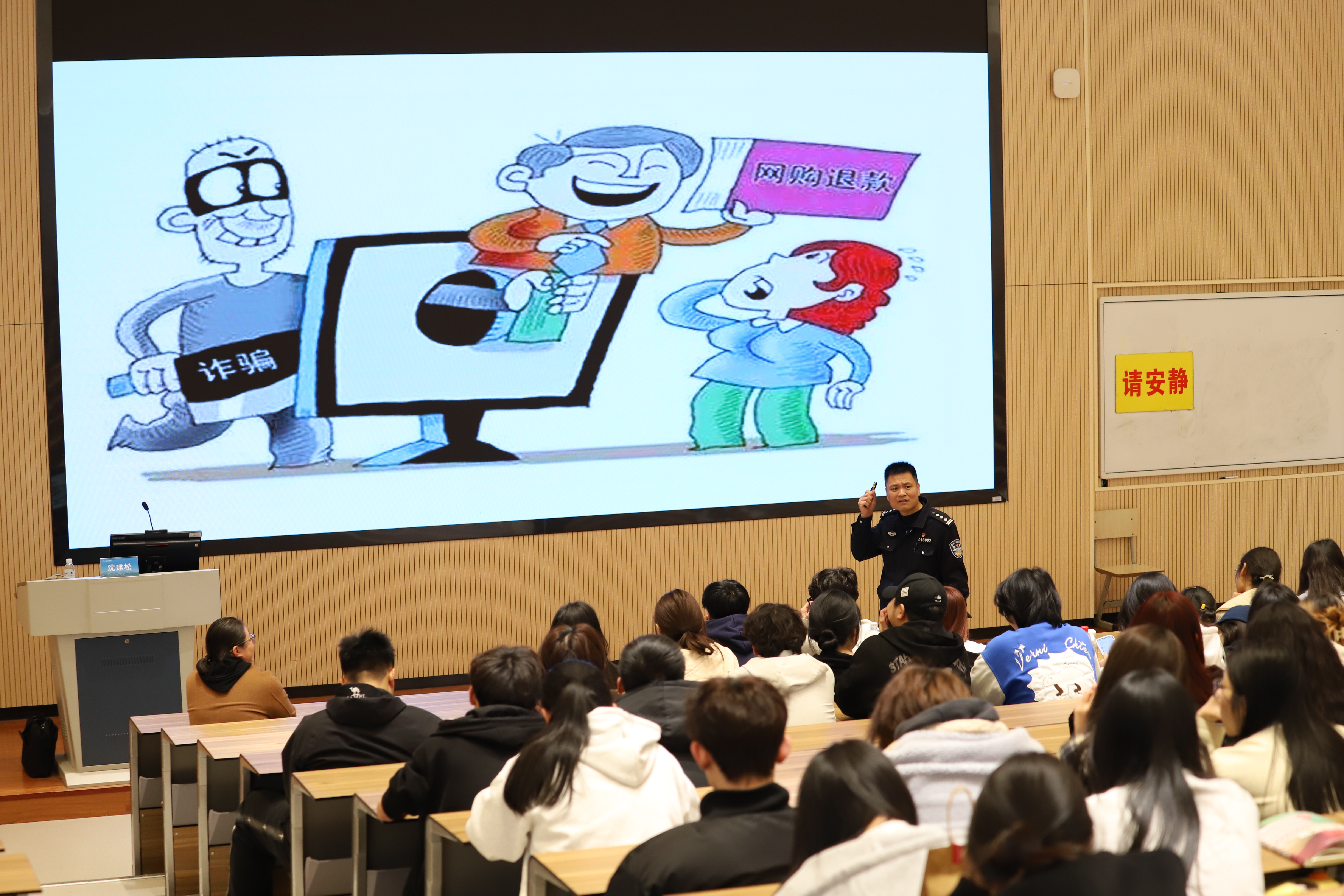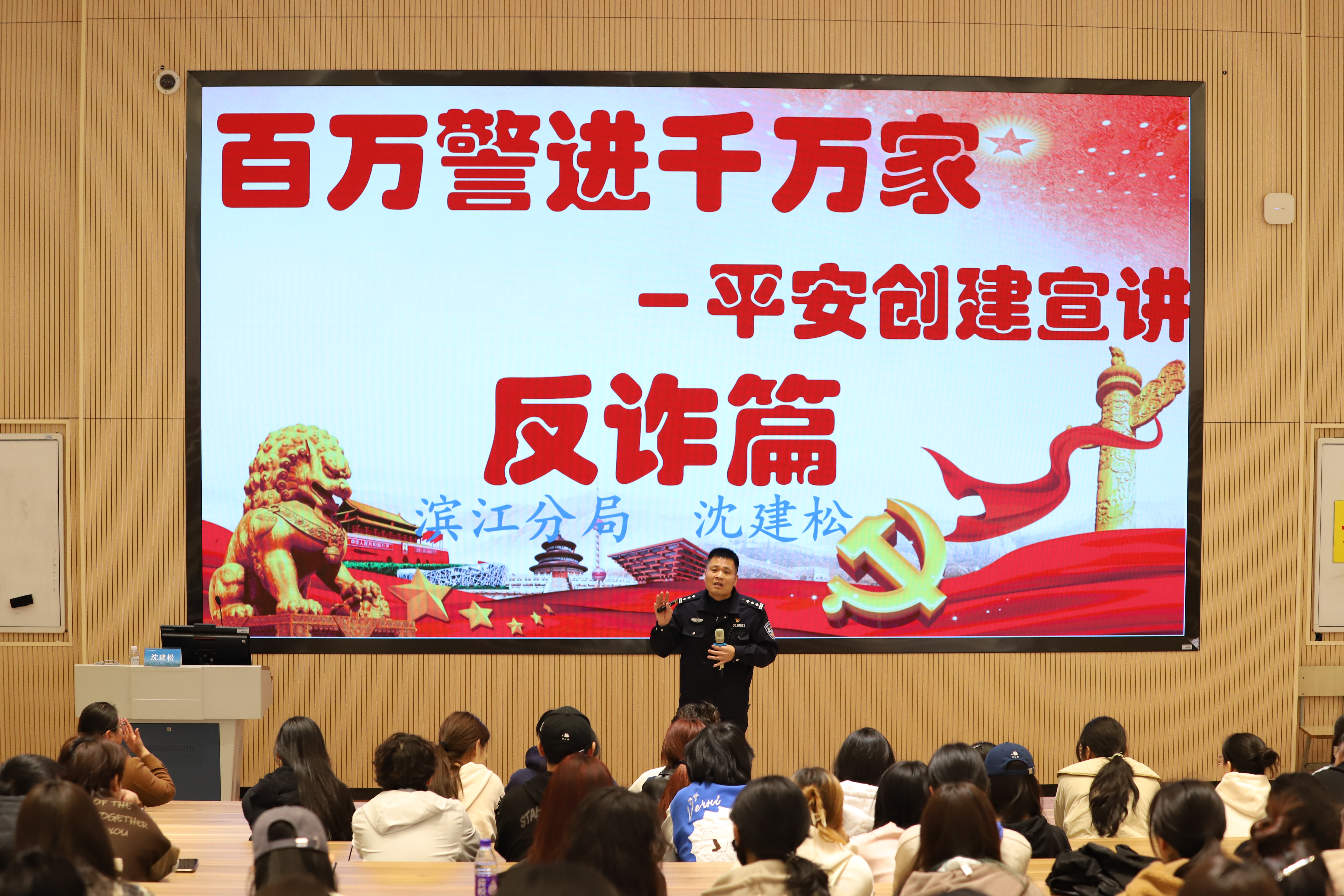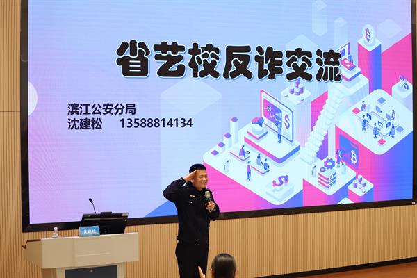 防诈于心,反诈于行。为进一步加强电信网络新型诈骗防范工作,提升学生防诈反诈意识,增强学生的法律意识和法治观念,有效遏制校内外诈骗案件发生,3月26日中午,演艺与教育学院联合校保卫处在阶梯二教室开展反诈安全教育讲座,杭州市公安局滨江分局一级警长沈建松警官受邀主讲。学院党总支副书记陈莹、辅导员于鹏以及各班团支书、班长、寝室长参加讲座。