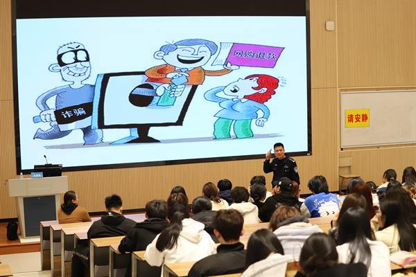诈骗手法花样多,不说不信不点击。沈建松用生动活泼的讲课形式,干货满满的讲座内容,向同学们仔细介绍了“裸聊诈骗”“刷单诈骗”“网购诈骗”等诈骗类型的特点和手段。他严肃指出,裸聊诈骗利用受害人的隐私进行敲诈勒索,严重侵犯个人尊严;刷单诈骗则是以高额回报为诱饵,骗取受害人的钱财,新版刷单诈骗将会以点赞、关注和做任务等方式实施诈骗;网购诈骗是通过各种优惠信息、客服退款、虚假网店实施欺诈。同时,沈建松结合“两卡”违法犯罪案件向学生论述和剖析了买卖“两卡”的严重危害性,提醒广大学生要时刻保管好自己的电话卡、银行卡等个人账户,不要为了蝇头小利出租、出售自己的电话卡和银行卡,让诈骗分子转移赃款使用,沦为犯罪分子的帮凶。