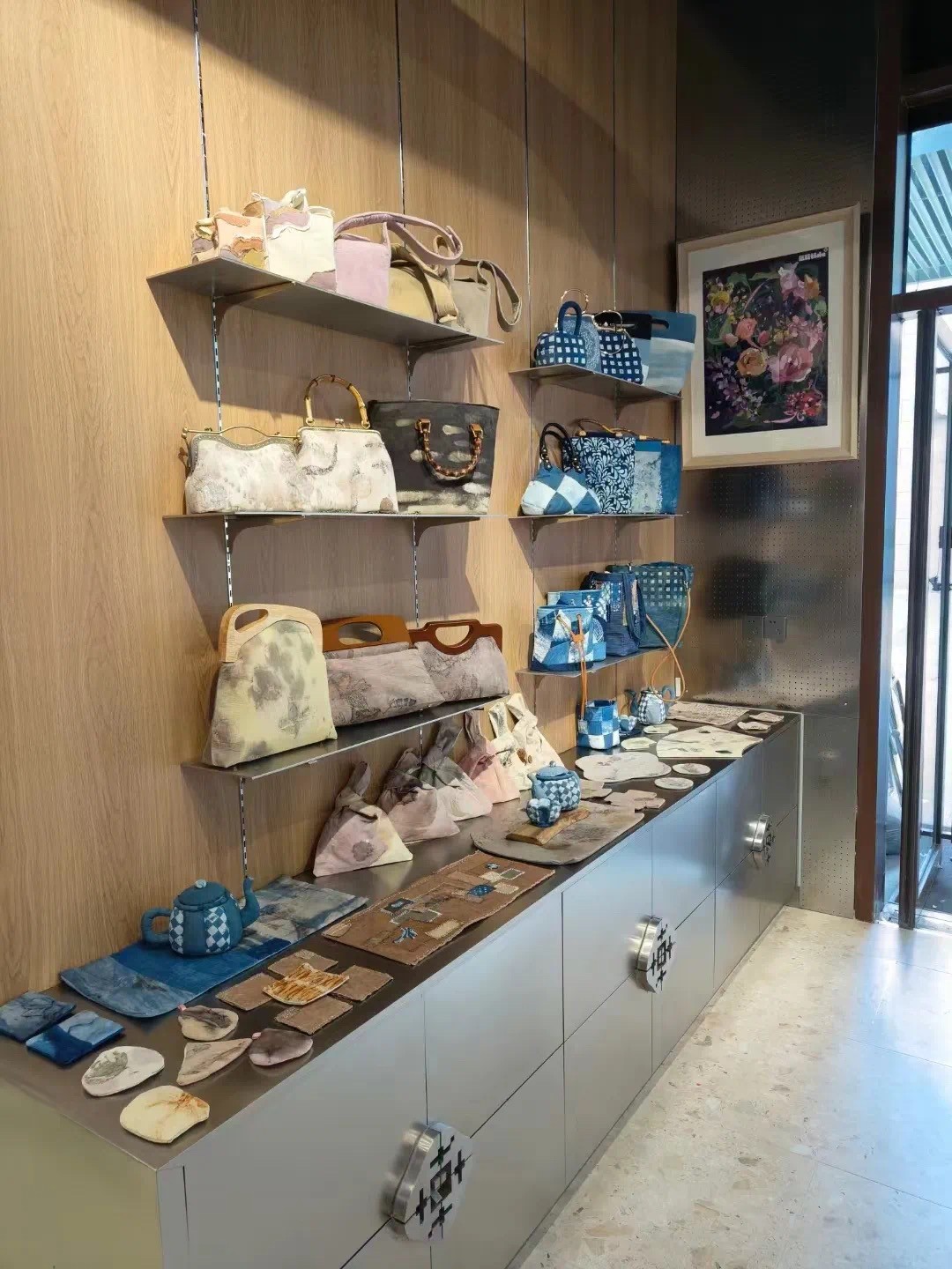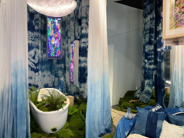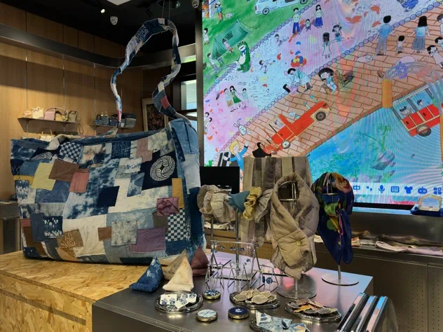 此次主题展览展出手工艺学院民族传统技艺传统印染方向学生定制的一系列创新印染产品,植物染丝巾、手工包、饰品纷纷亮相,创新的设计和精巧的手工得到了现场观众的认可,大受欢迎,进一步提供了学生创新创业的新途径。此外,展览还结合了数智化的展陈方式,通过巧妙融合科技元素,丰富了产品的色彩质感和表达方式。