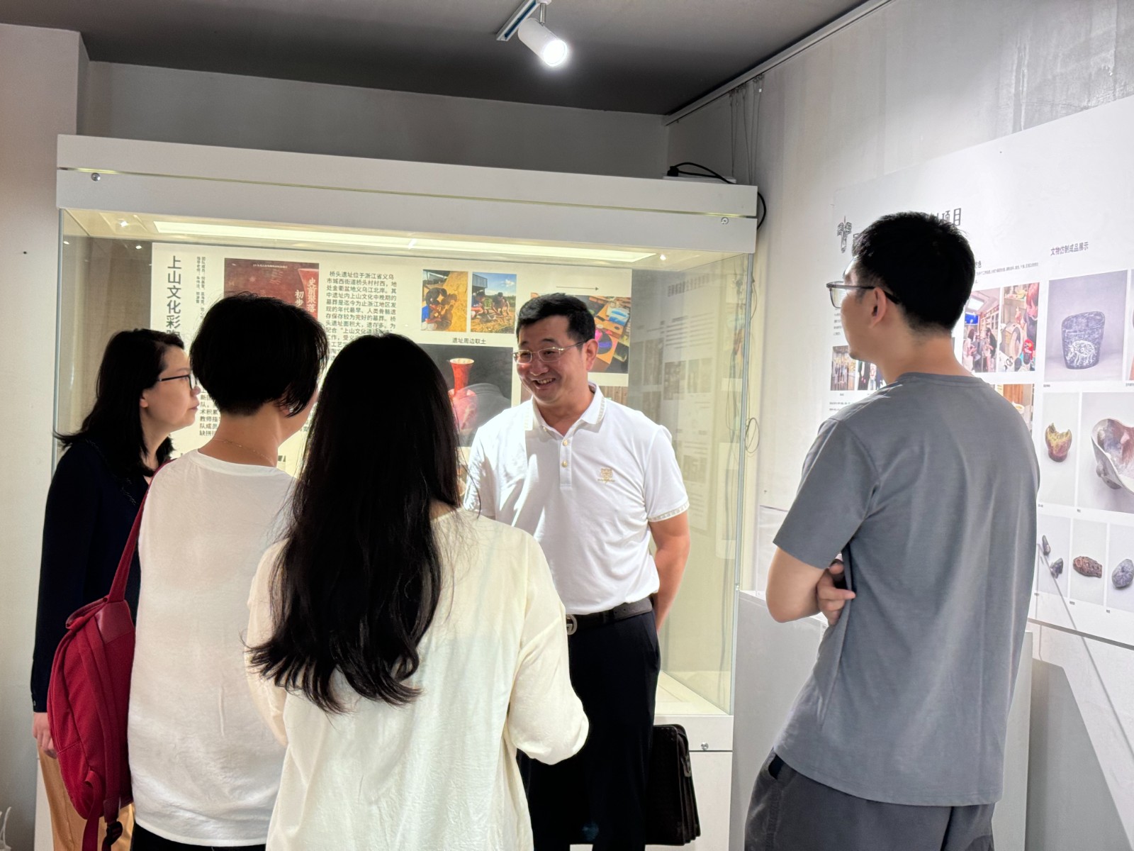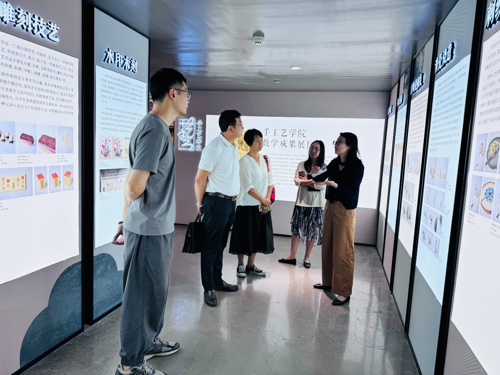 在手工艺学院领导班子和文物修复与保护专业教研室相关教师的陪同下,吉林省复善文化发展有限公司一行参观了“遗·起潮”手工艺学院“时光造物”非遗创意成果展、“古艺新续”手工艺作品展、龙泉剑村刀剑研究院邀请展。