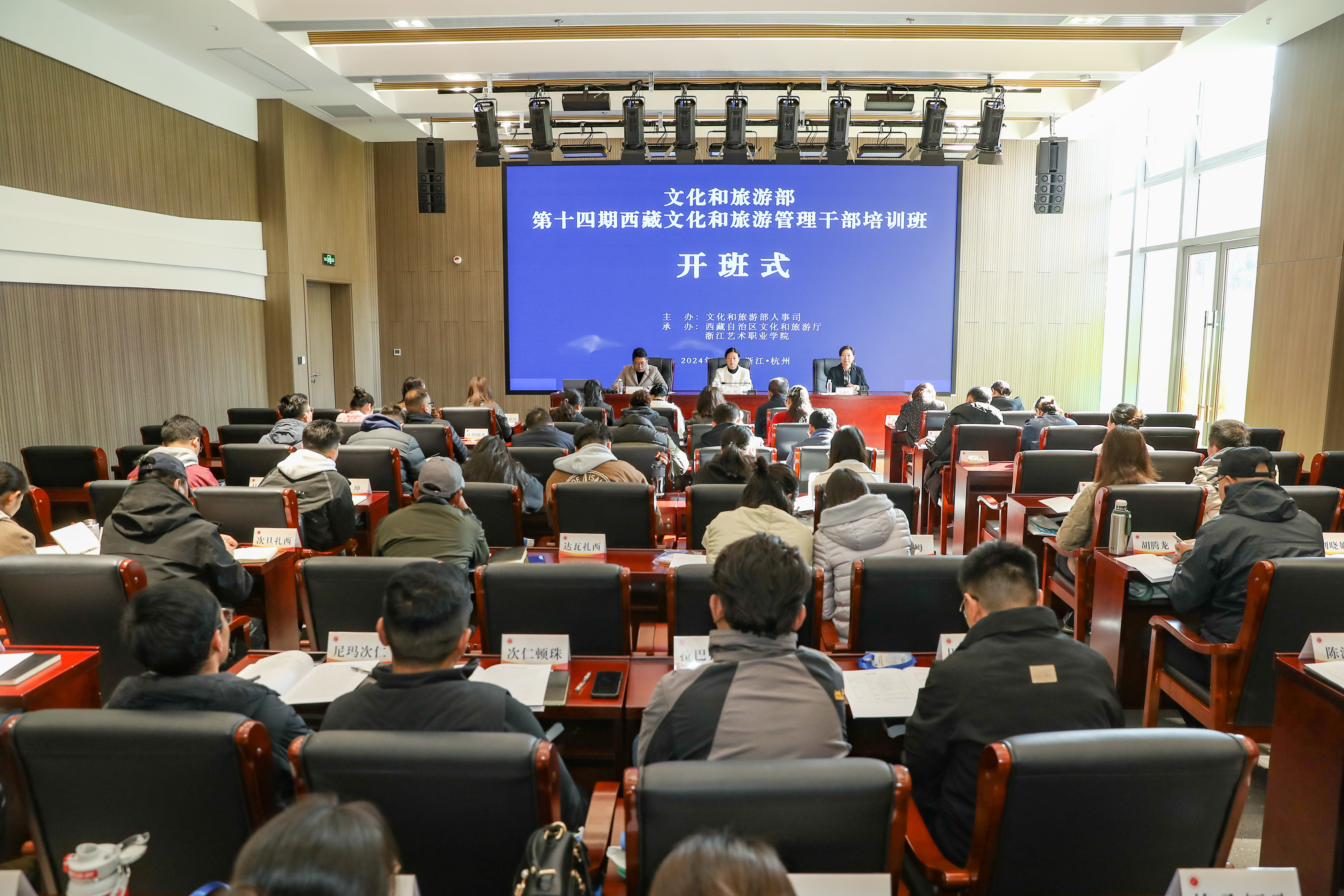 此次培训班是文化和旅游部文旅人才援藏的品牌项目,文化和旅游部人事司提前安排、多方联系,确定作为文旅部浙江培训基地的浙江艺术职业学院承办培训。西藏自治区文化和旅游厅党组高度重视本次培训,将其纳入《2024年度西藏自治区文化和旅游厅干部人才培训计划》,会同浙江艺术职业学院研究制定培训方案。培训内容包括《贯彻党的二十届三中全会精神 深化文化体制机制改革》《互联网+文化产业以杭州为重点样本》《产业化,生活态与非遗保护的专属权困境》《浙江省文旅融合的实践经验和思路举措》《学习习近平文化思想的传统文化观,提升领导干部的政德修养》《夜间文旅经济发展策略》等专题讲座,杭州亚运会博物馆、大丰科创中心、之江文化中心、西溪湿地、海宁市周王庙镇云龙村、盐官镇桃园村、海宁市一岛三街区(非遗馆、国潮岛、徐志摩旧居、南关厢历史街区、干河街历史街区)等地的现场教学和观摩。