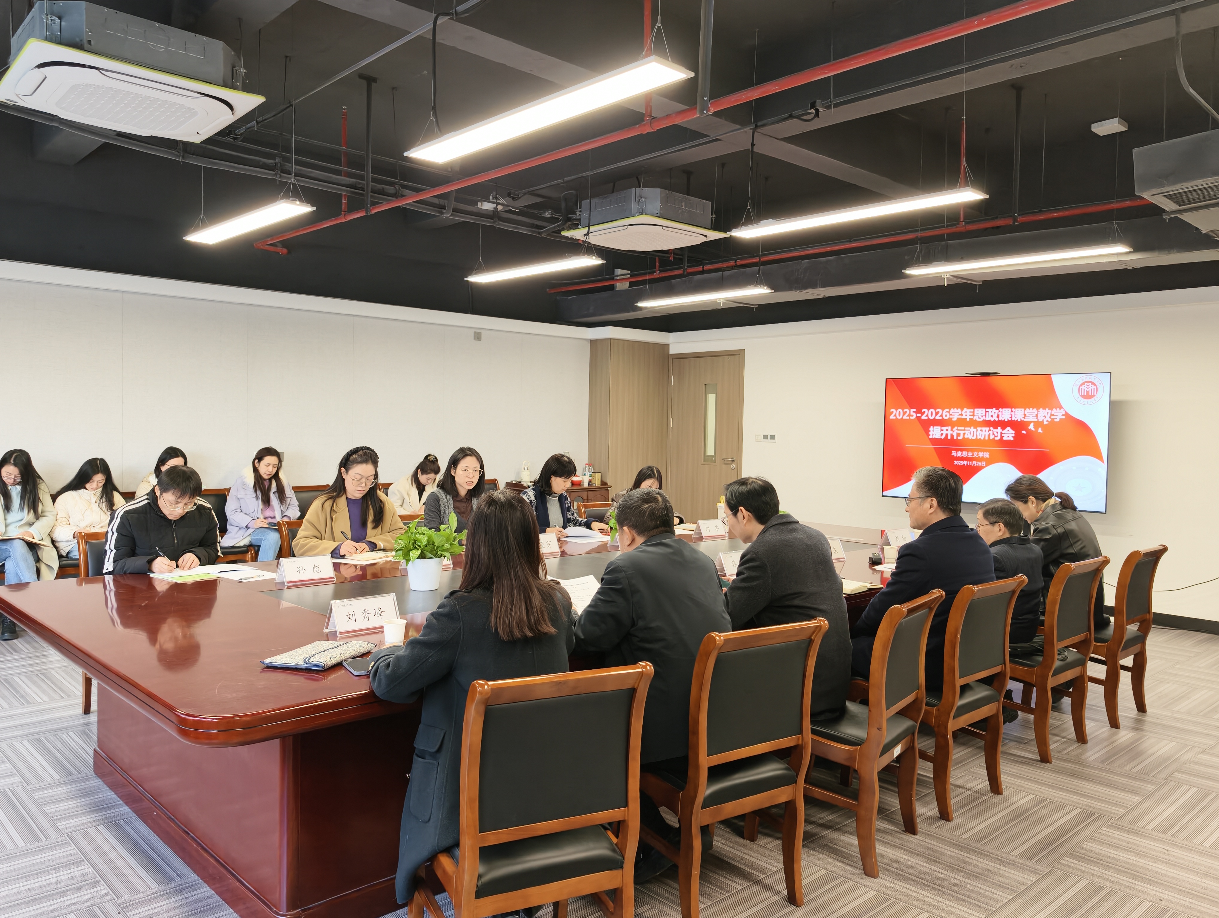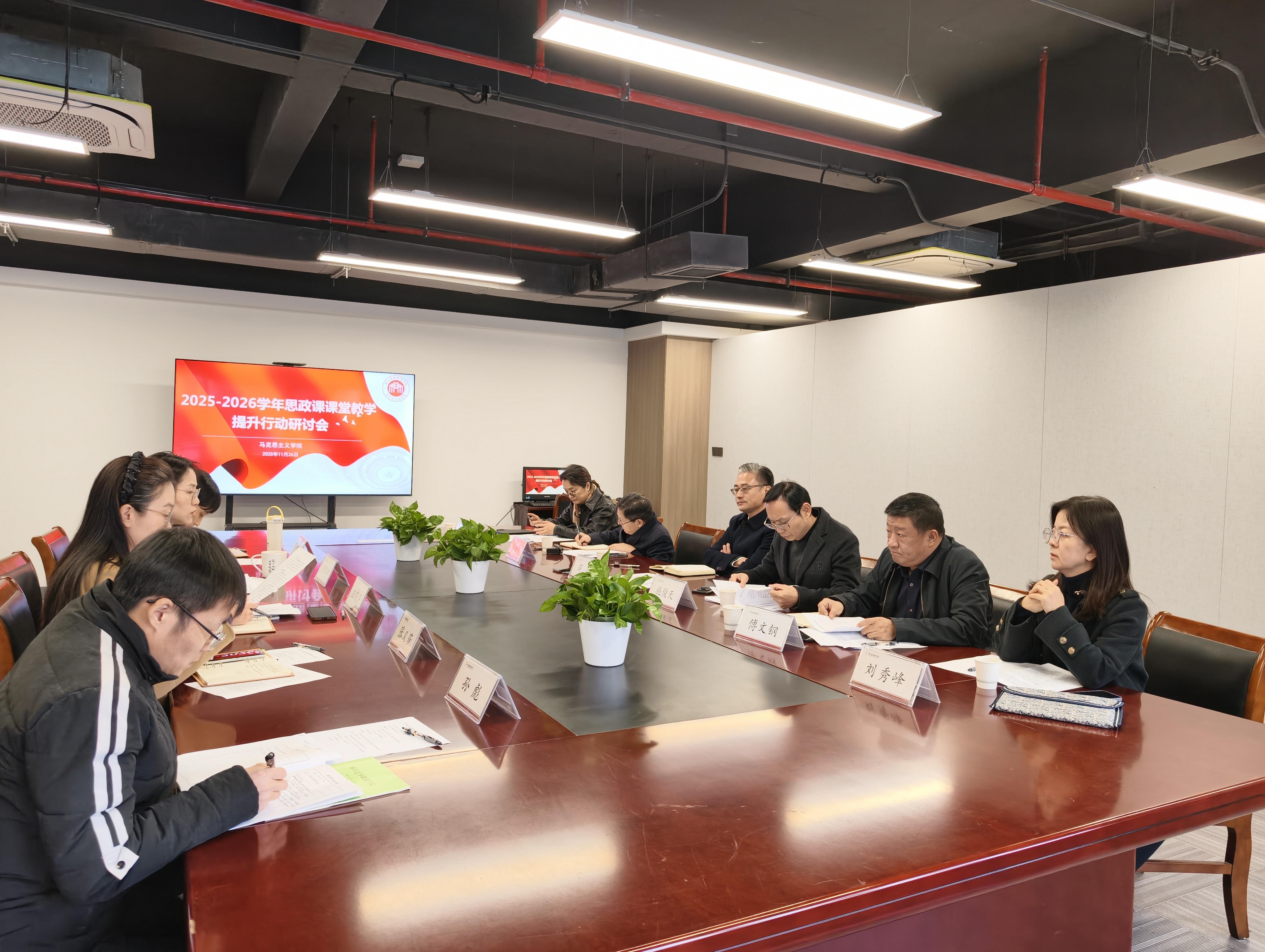 为深入贯彻习近平总书记关于思政课建设的重要指示精神,执行好上级教育主管部门有关工作要求,切实提升思政课课堂教学质量与育人实效,11月27日,我校在教学综合楼A208召开2025-2026学年思政课课堂教学质量提升行动研讨会。校领导薛亮、施俊天、刘杨、刘秀峰、傅文钢,学校教学总督导马向东,马克思主义学院全体教职工参加会议。会议由党委委员、宣传部(统战部)部长傅文钢主持。