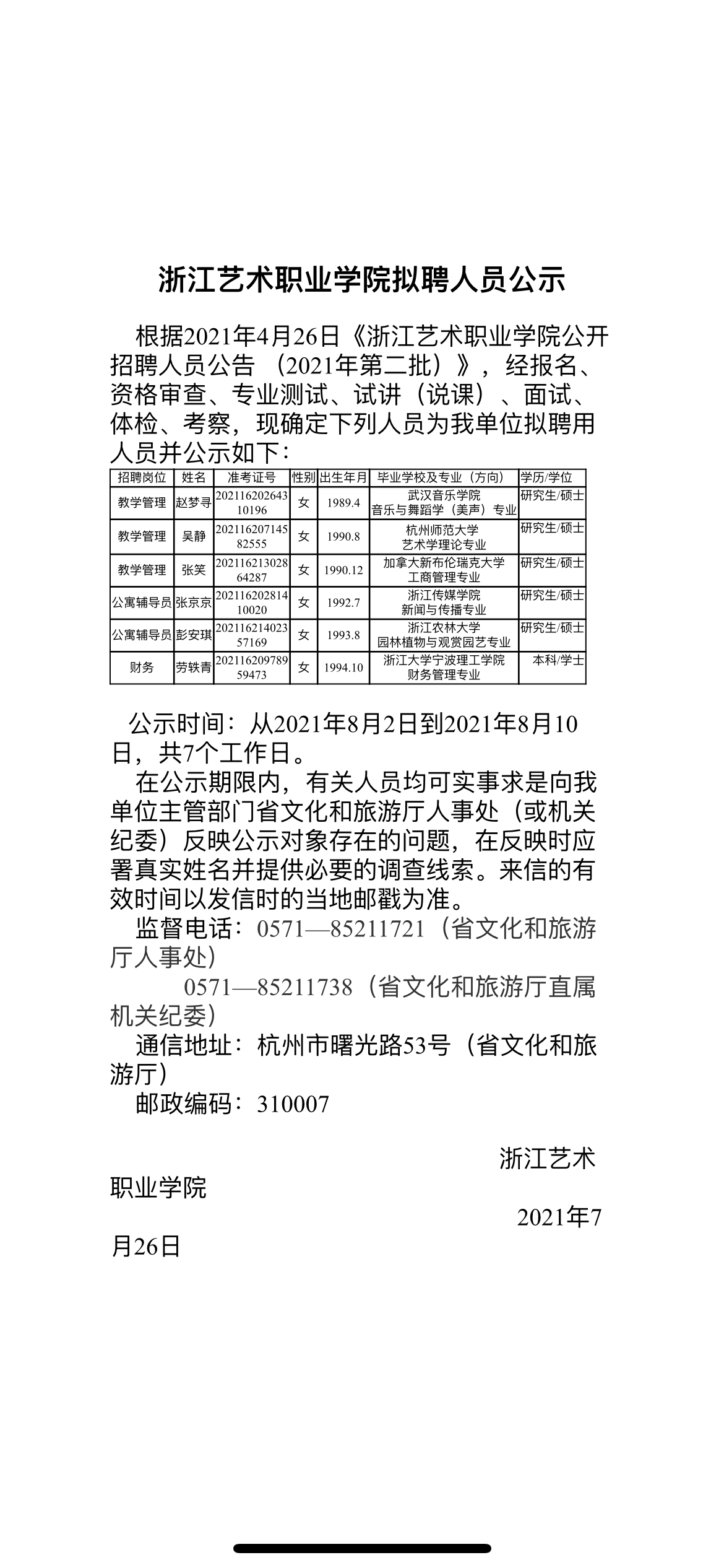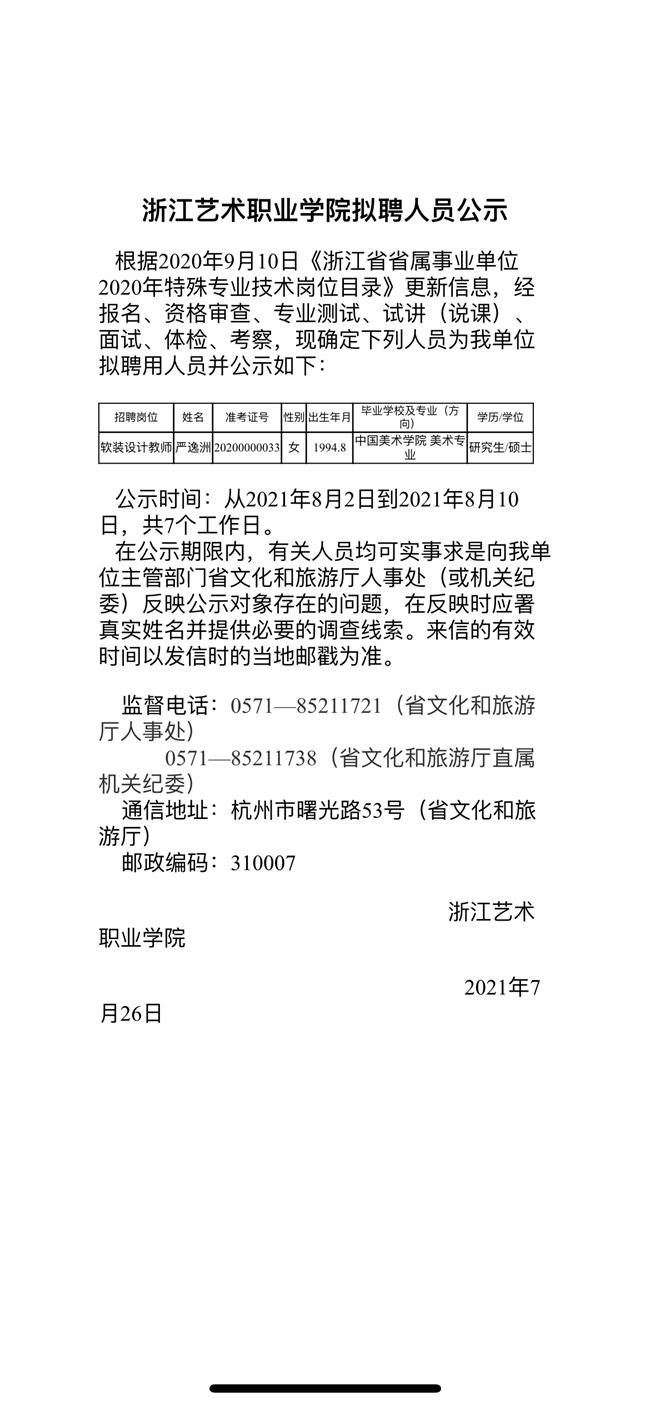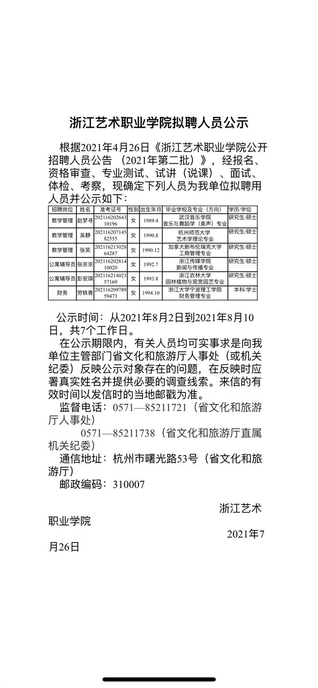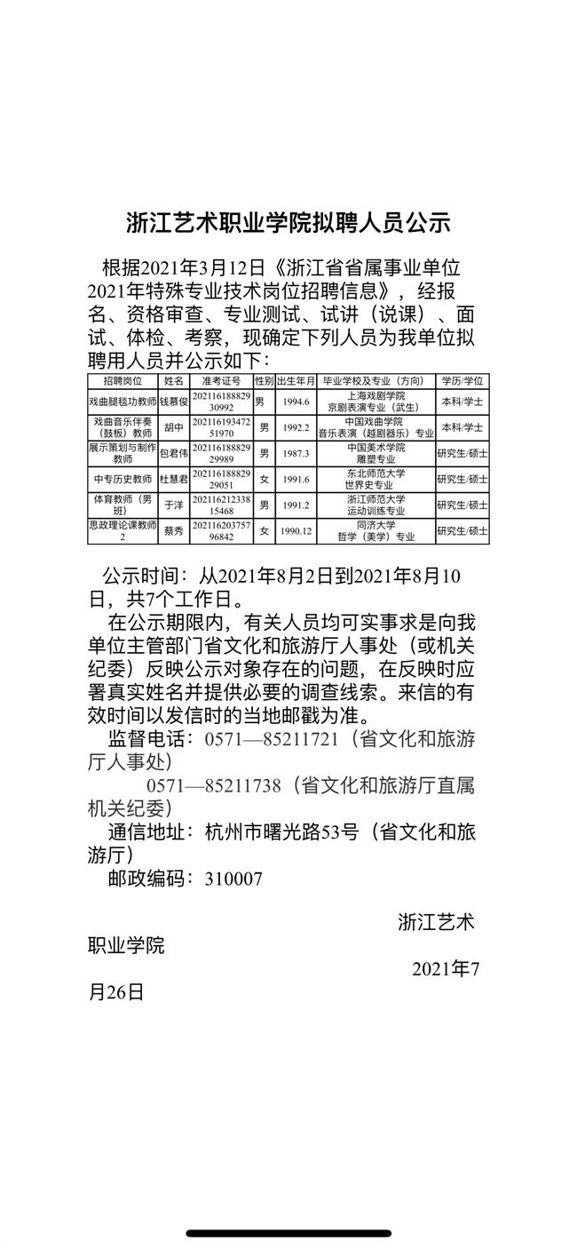 浙江艺术职业学院拟聘人员公示