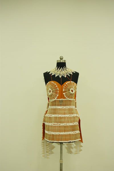 本次展出作品共有26件,创意云集,亮点纷呈。这是浙艺院美术系服装专业第一届创意与技能教学实践,主题为“杂货铺的童话”。11服装班和12服装班全体学生共52名学生参加,两名同学为一个小组,在限定时间内使用非辅用材料设计制作一件服装单品。本次教学实践,不仅是对同学们所学到专业知识的一种考核,更是对团队协作能力的一种测试。