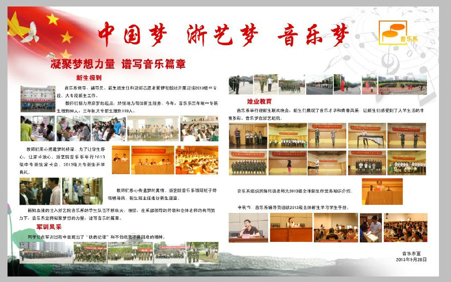 为深入学习贯彻党的十八大精神,引导全院广大学生为实现国家富强、民族复兴、人民幸福的伟大“中国梦”而勤奋学习、立志成才、积极进取,根据浙江艺术职业学院《关于深入开展“我的中国梦”主题教育活动的通知》精神,组织全院各教学单位开展“中国梦”主题教育宣传栏比赛。经过一个月的精心策划、制作,各教学系部策划制作出各具特色的“中国梦”主题宣传栏,有的反映各系教学风采和学风精神,有的反映师生对于“中国梦”的向往,有的对“中国梦”进行溯源,等等,参评作品有着较高的质量,令人耳目一新。