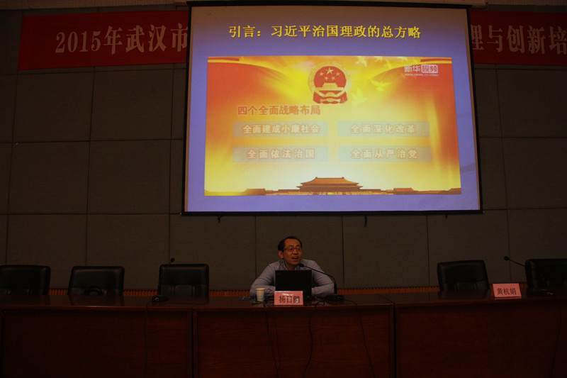 杨日鹏从准确把握“四个全面”战略布局的丰富内涵、深刻领会“四个全面”战略布局的内在逻辑、统筹协调“四个全面”战略布局的贯彻落实三个方面紧紧围绕以习近平同志为总书记的党中央提出的全面建成小康社会、全面深化改革、全面依法治国、全面从严治党“四个全面”战略布局主题,结合图片资料进行生动的阐述。他重点强调“四个全面”战略布局的内在逻辑,即全面建设小康社会是纲领性目标、全面深化改革是核心动力、全面依法治国是重要保障、全面从严治党是内在主线。在国内新常态、国际新格局这一历史新时期背景下,我们只有保持战略定力、坚定理想信念、传承中华文明才能统筹协调“四个全面”战略布局的贯彻落实。