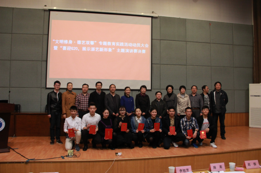 4月7日晚,浙江艺术职业学院“文明修身·德艺双馨”主题教育实践活动动员大会暨“喜迎G20,展示浙艺新形象”文明修身主题演讲赛决赛在图信中心举行。学院党委书记朱海闵、党委副书记黄杭娟、党委委员、纪委书记夏开堂出席,学院各职能部门、教学系党总支负责人担任决赛评委,200余名学生代表参加活动。