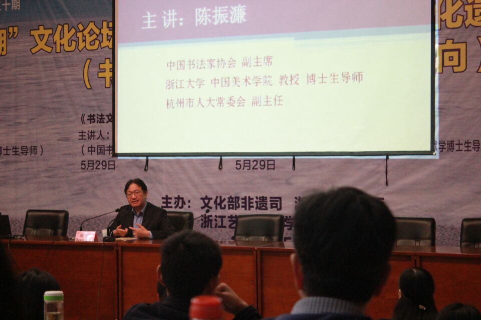 5月29日上午,中国非物质文化遗产传承人群培训班第二期大师讲座“书法文化与非遗保护”在浙艺图信中心开讲,主讲人是中国书法家协会副主席、浙江大学教授、博士生导师陈振濂。