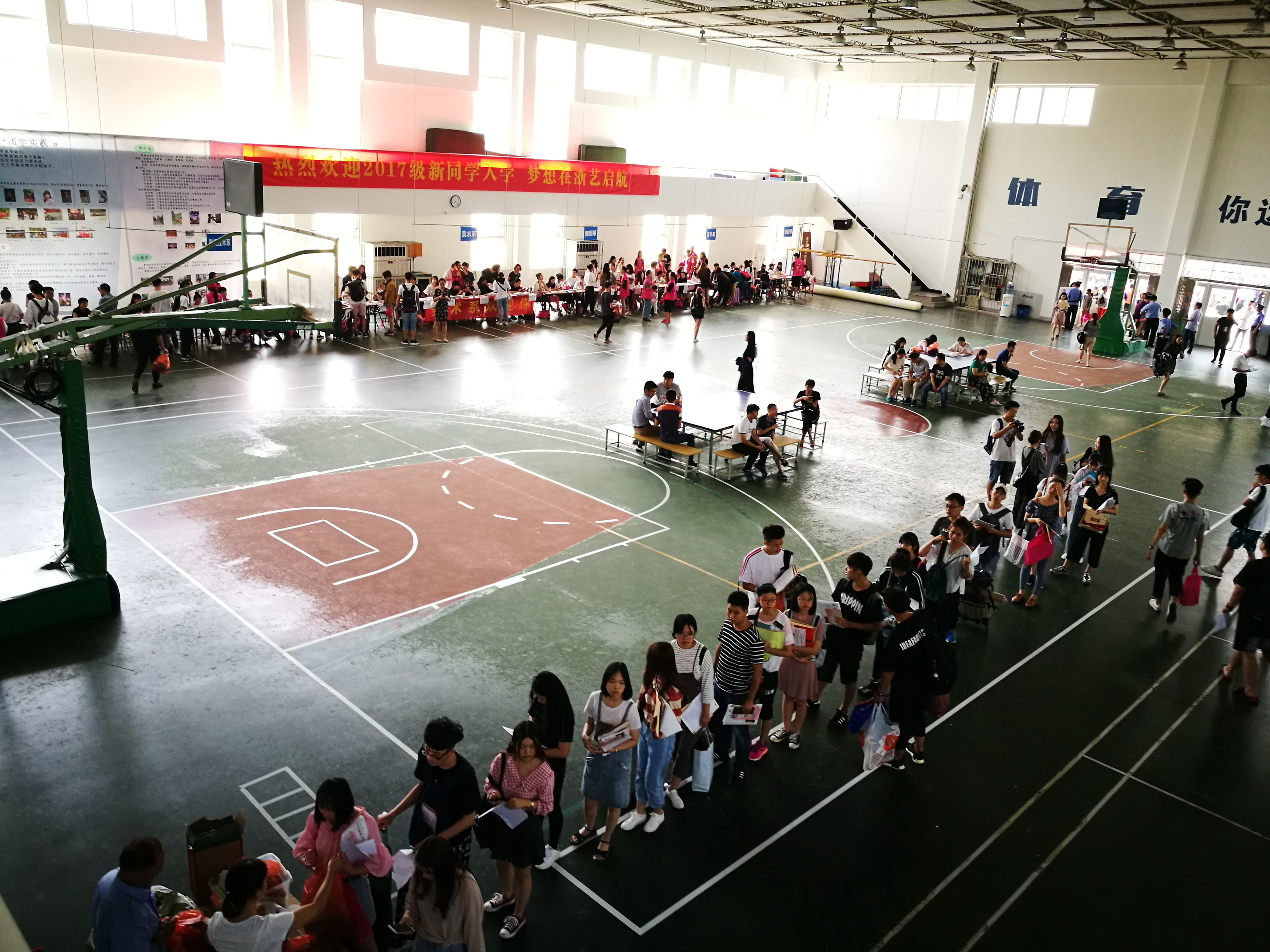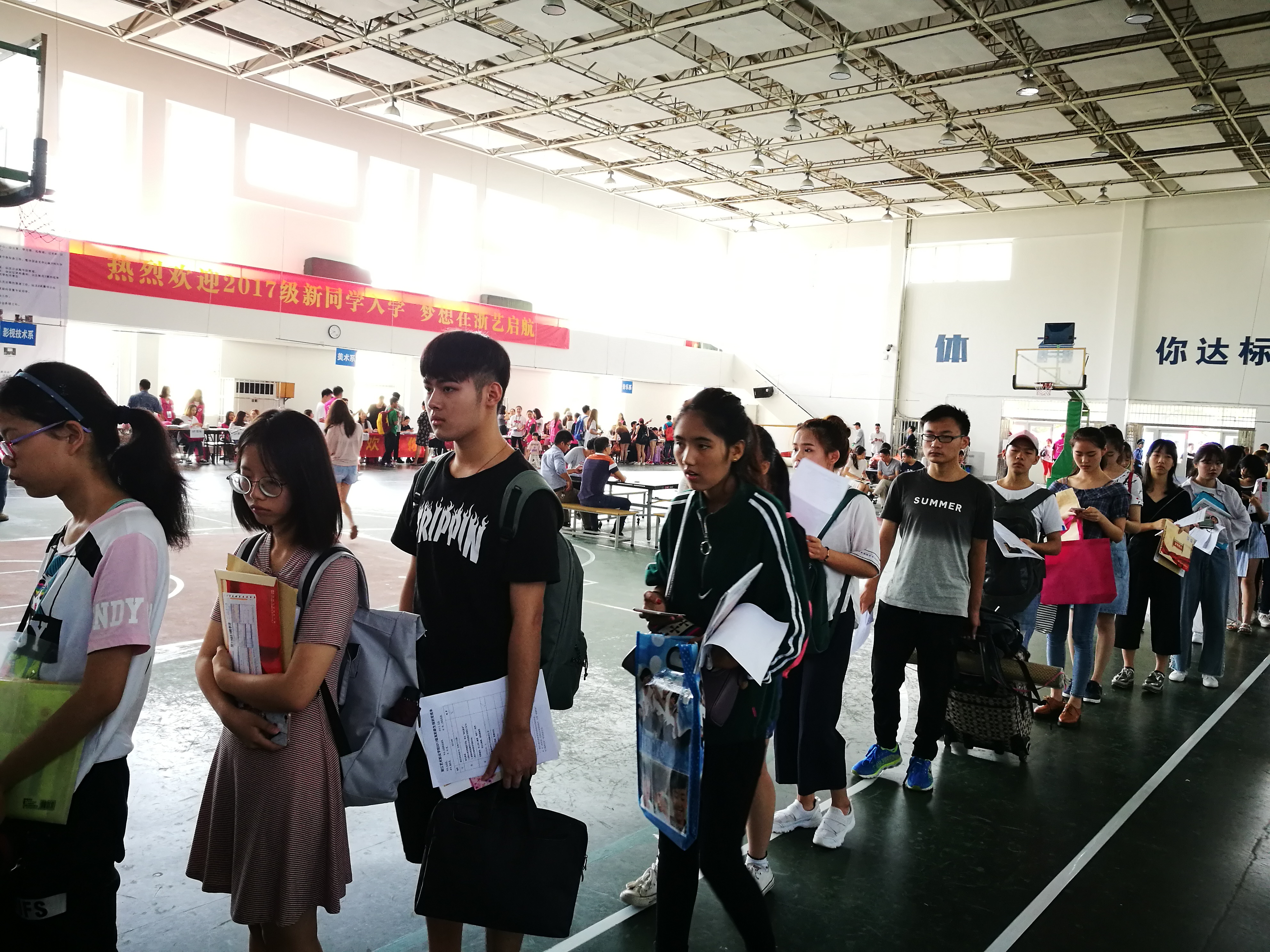 今天的杭州阳光正好,浙艺的体育馆里外萦绕着热烈的气氛,清晨就有从各地赶来的新生聚集在报到现场,在志愿者的引导下有序办理入学手续。度过了人生中最漫长的一个暑假,从嘉兴赶来的文化管理系17级策划班的许同学告诉记者,在新的学校,有遇见新同学的期待,有离开父母的不舍,其实更多的是对大学生活的期待,“这一切都汇集在今天,今天就成为人生里难忘而特殊的一天。”