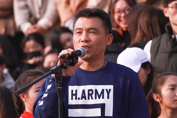 17级音乐系李响同学作为学生代表发言:“严格遵守比赛规则,严格保证赛场纪律,服从裁判,尊重对手,发扬拼搏精神,胜不娇,败不馁,发挥出最好成绩,祝本届运动会圆满成功!”