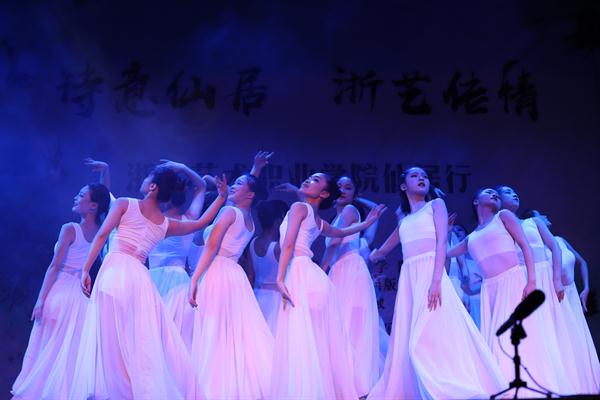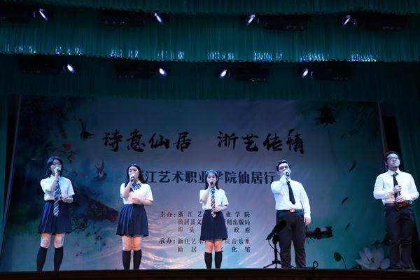 授牌仪式后,浙艺师生为当地群众作了精彩演出。由古筝、扬琴、中软、琵琶等民族传统乐器组成的弹拨乐重奏《鲁腔》拉开了晚会的序幕,笛子独奏《牧民新歌》富含田园气息,阿卡贝拉《小九妹》表演形式令村民们耳目一新,群舞《八女投江》演绎了革命烈士的英勇无畏,萨克斯独奏《此情不移》旋律悠扬,女声独唱《芦花》声声动人,《流行舞串烧》和群舞《不想说再见》青春洋溢,古筝独奏《西部主题畅想曲》仿佛将观众带回了古时的西域,演出在女声独唱《中国进入新时代》中落下了帷幕。整台节目丰富多彩,村民们赞叹不已,更有村民说:“浙艺真是全省文艺人才的‘黄埔军校’啊”!当晚演出进行了现场直播,点击量达12.3万人次。次日晚,浙艺师生在仙居县淡竹乡下叶村再次进行专场演出。