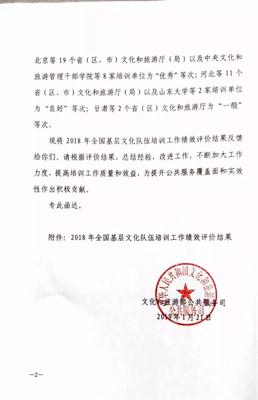近日,文化和旅游部公共服务司通报了2018年全国基层文化队伍培训工作绩效评价结果,浙江省文化和旅游厅、浙江艺术职业学院双双获评“优秀”等次。这也是文化和旅游部自2016年实施绩效评价工作以来,我校连续三年被评为“全国基层文化队伍培训工作优秀单位”。今年除了国家培训基地外,我校位列各省市基地第一。