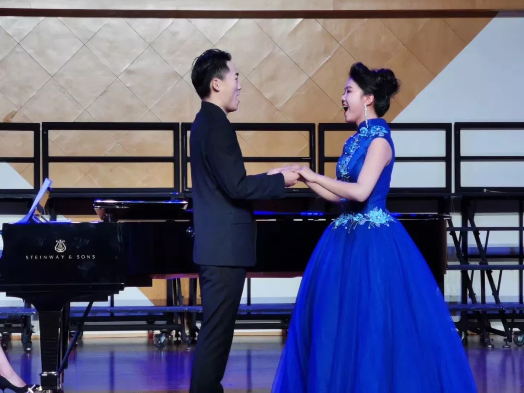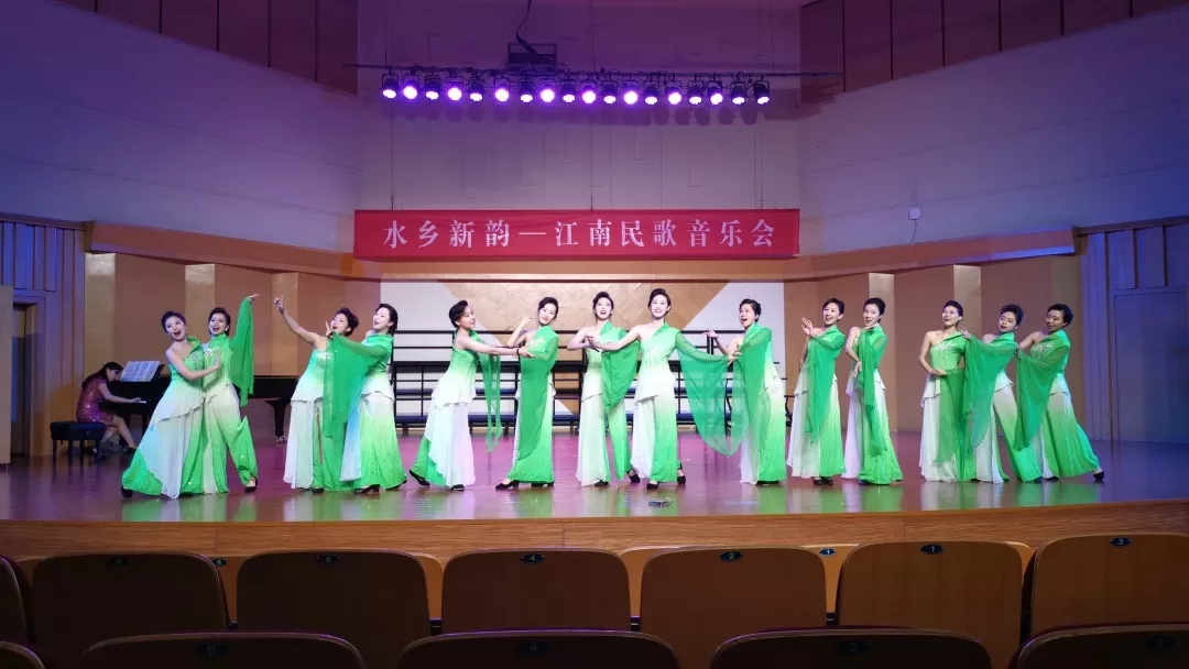 “溪水清清溪水长,溪水两岸好风光……”音乐会在《忆江南·新采茶》的旋律中开启。这首改编自家喻户晓的江浙民歌《采茶舞曲》的新版女声小组唱作品,由10名女生演绎。在我国民族民间音乐大家庭中,江浙一带的民歌以其清新委婉、活泼灵动的特质占有重要位置。音乐会上,江苏民歌《紫竹调》《四季相思》《拔根芦柴花》是耳熟能详的江南曲调,用女声重唱、独唱的形式展现出原样风貌。女声联唱《茉莉花》合着富有爵士乐韵味的钢琴伴奏,使这首地道的江南民歌有了现代新民歌的意味。用温州方言演唱的《对鸟》由刚刚获得2019全国职业院校技能大赛声乐赛项二等奖的张銮楠同学带来,这首在温州几乎人人会唱的地方民歌收获了现场观众的热情欢迎。创作于上世纪九十年代的《茶山情歌》最初由歌手杨钰莹用通俗唱法演绎,在这次音乐会上,4位女生用载歌载舞的表演唱形式再度将这首江西民歌搬上了舞台,别有一番风味。用沪语演唱的上海民歌《啥鸟飞来节节高》,透过婉转的曲调,吴侬软语的江南韵味油然而生。