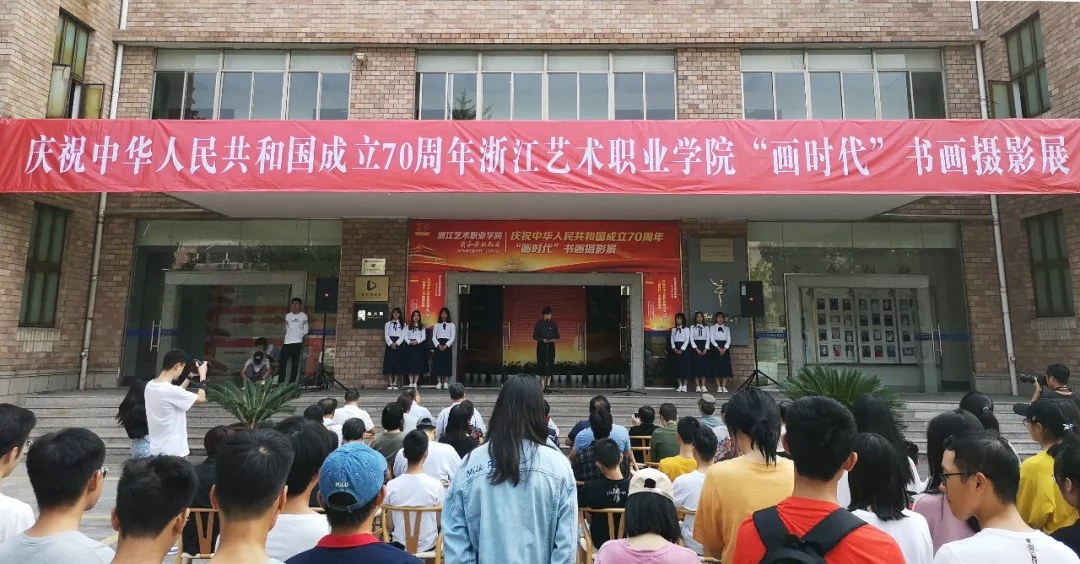 为庆祝中华人民共和国成立70周年,浙江艺术职业学院举办以“我和我的祖国”为主题的“画时代”书画摄影展,今天上午在美术系展厅举行开幕式。