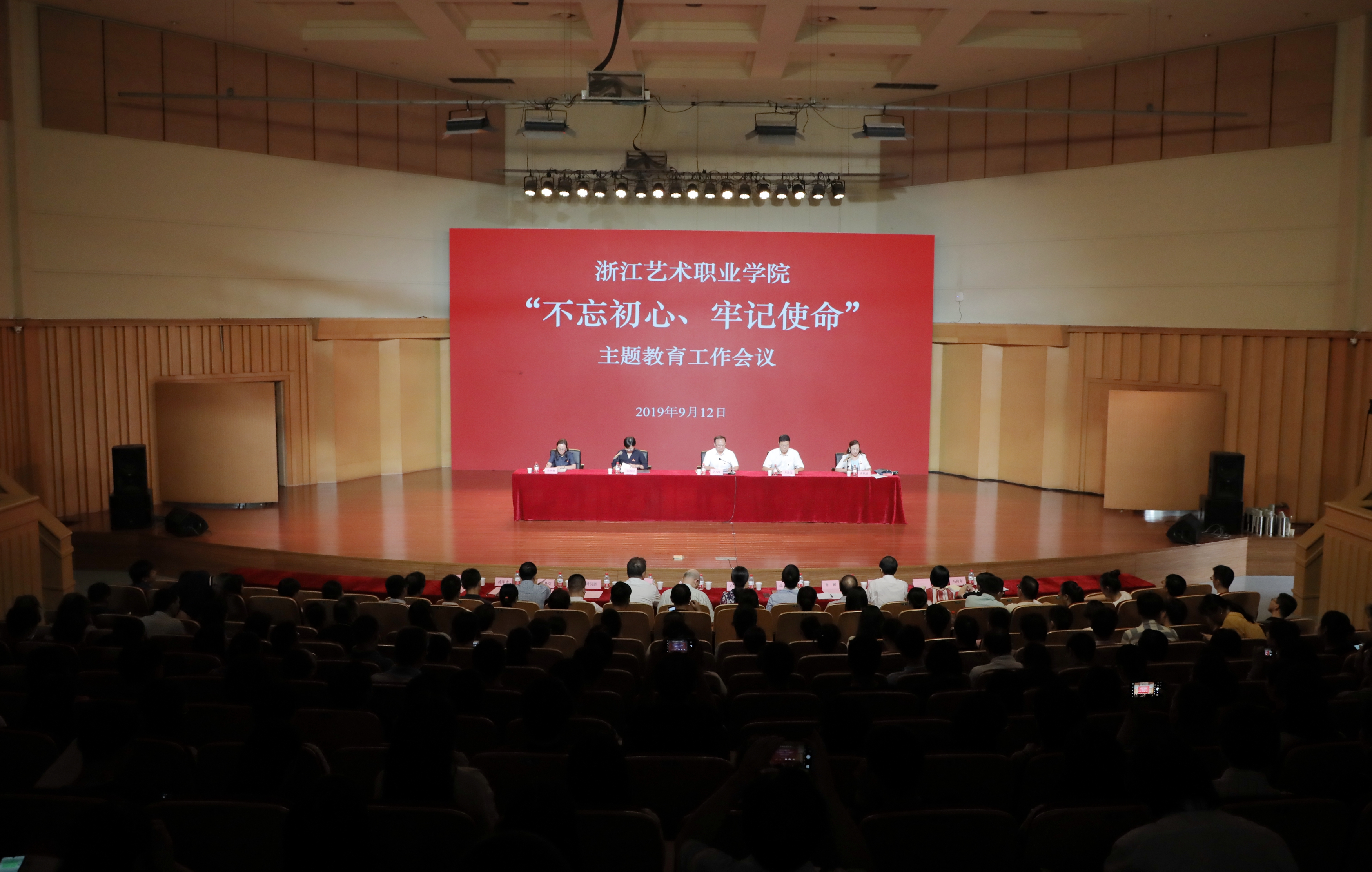 9月12日下午,浙江艺术职业学院召开“不忘初心、牢记使命”主题教育工作会议,深入学习贯彻习近平总书记在“不忘初心、牢记使命”主题教育工作会议上的重要讲话精神,贯彻落实中央和省委关于第二批主题教育的部署要求,对全校主题教育进行全面动员和重点部署,明确目标任务、工作举措和具体要求。省委主题教育巡回指导组第十四组组长华乃强出席会议并讲话,巡回指导组副组长方达伟、省文化和旅游厅直属机关党委专职副书记吴莘超、巡回指导组成员出席会议。校党委书记朱海闵作动员部署,党委副书记、院长黄杭娟主持会议,校党委班子成员、全体处以上干部、全体党员和各民主党派负责人参加会议。