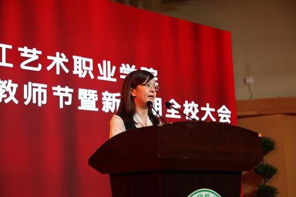校党委书记朱海闵讲话,代表校党委、行政向全体教职员工表示节日祝贺,向为人师表、潜心育人的各位老师致以崇高敬意。她指出,梳理历年来教师节的主题,不管时代如何变迁、社会如何进步,总离不开尊师重教、弘扬师德、立德树人、提升地位等。今年主题是“庆祝新中国七十华诞,弘扬新时代尊师风尚”,新时代必将赋予教师新的使命和任务。