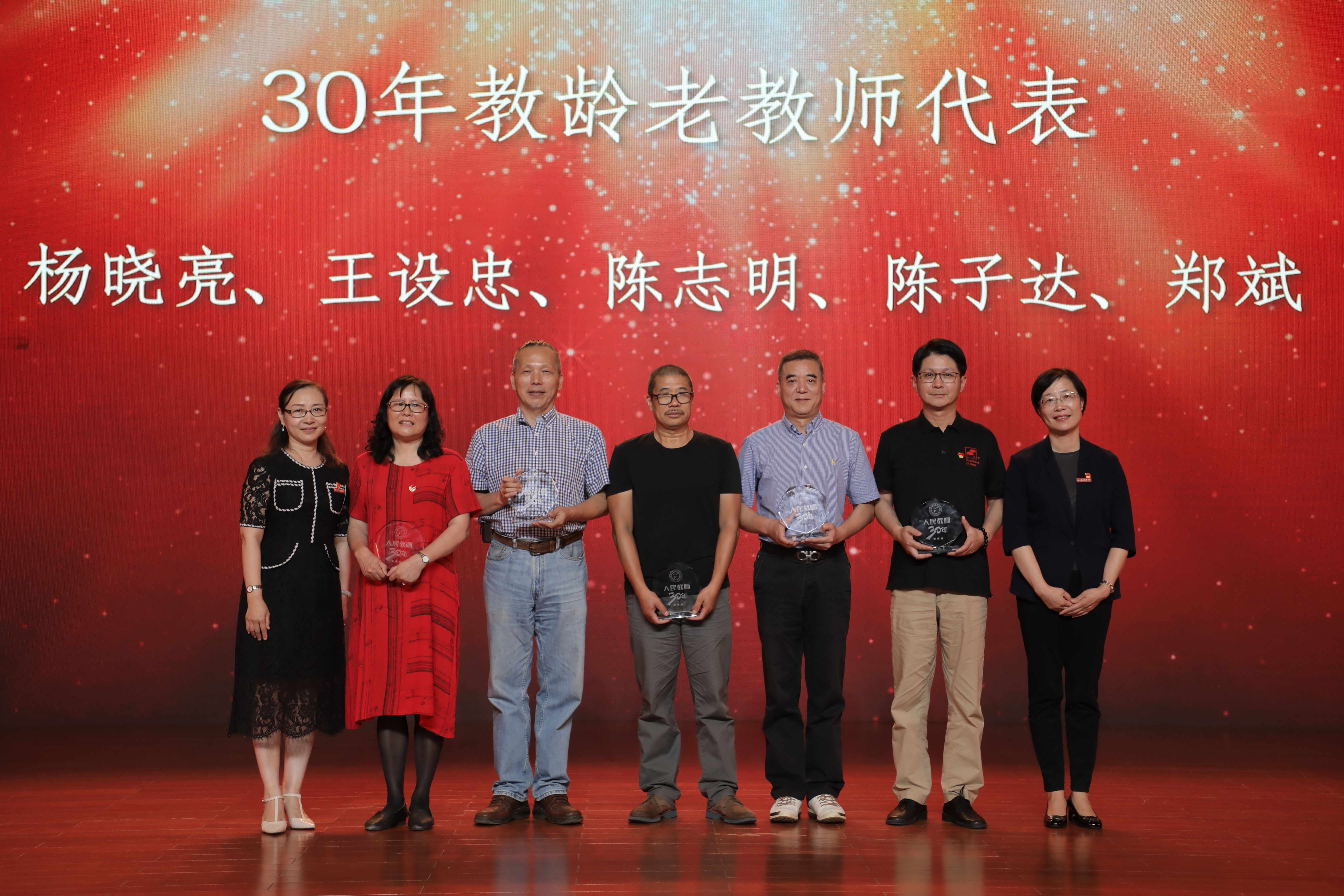近10年,我校有50余位老师获得三十年教龄荣誉证书。会上,学校为获得荣誉证书的教师代表杨晓亮、王设忠、陈志明、陈子达、郑斌等颁发纪念章。