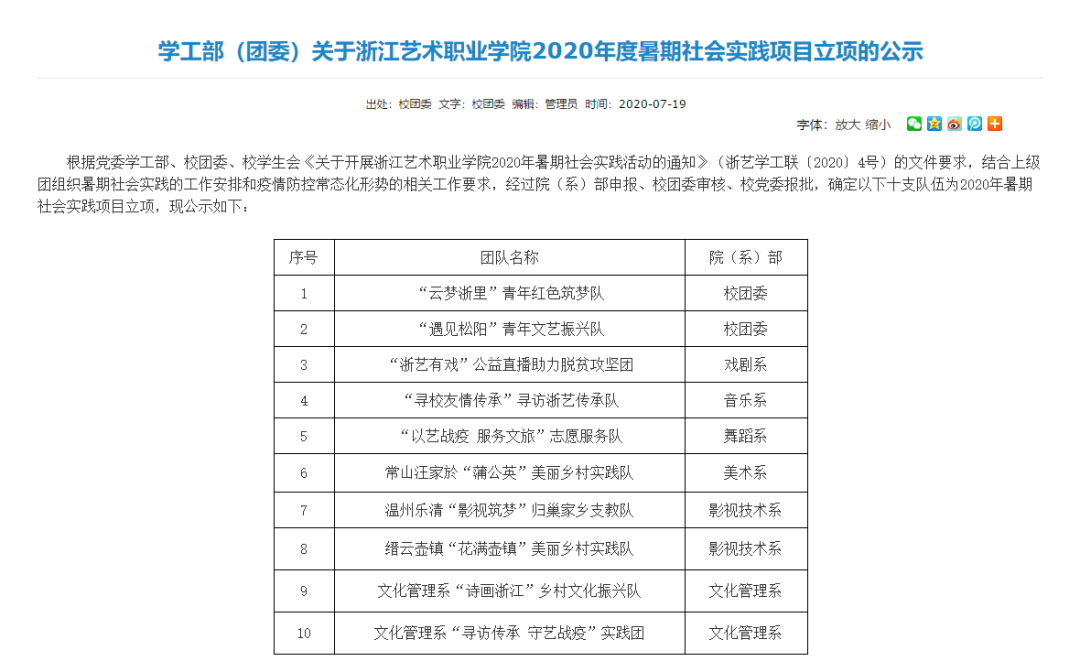 接地气,增精神,长才干,社会实践和志愿服务皆是美育教育实践育人的重要载体,是课堂思政向外延伸的通路。近年来,我校一直在增强育人实效上下功夫,逐年通过各院(系、部)“申报立项”的方式实施暑期社会实践。2019年共有4支团队获得省级重点团队立项,三支团队获得当年暑期社会实践风采大赛先进团队,2020年,又有10支团队获得校级立项。