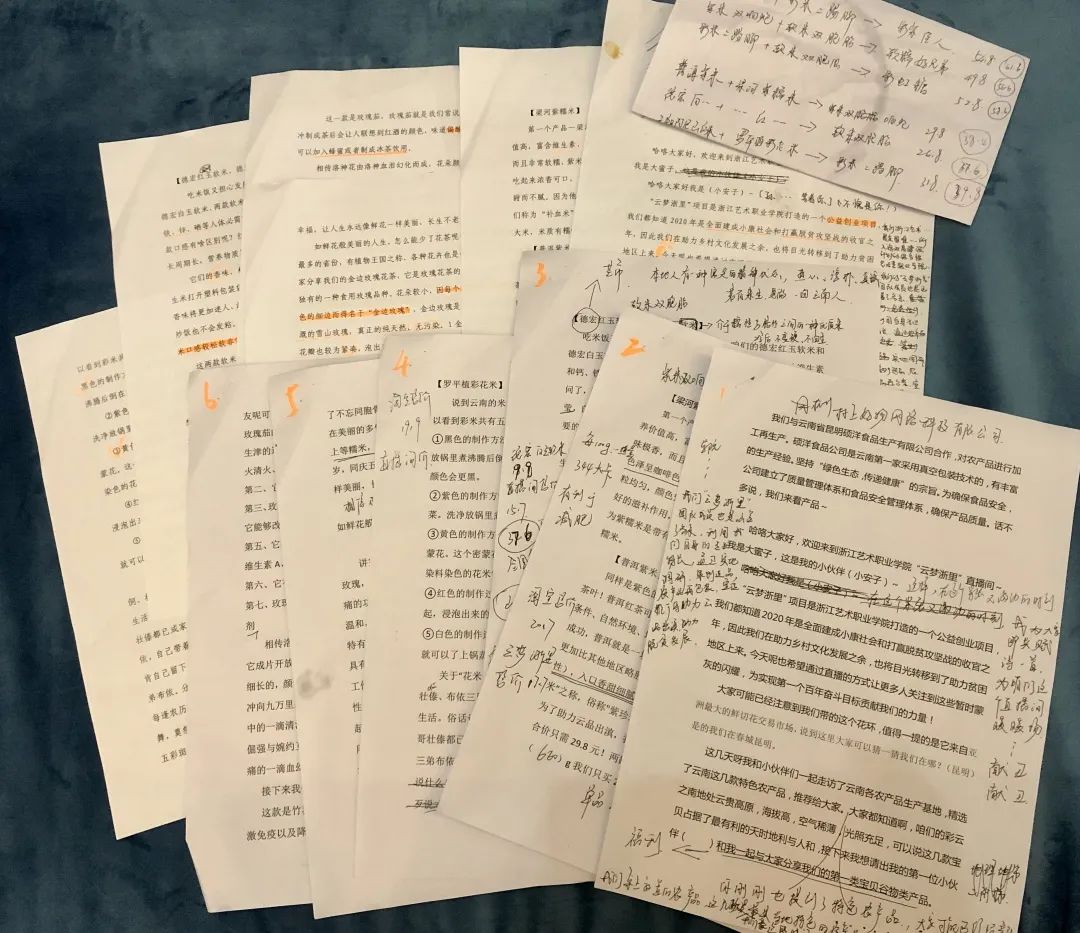 八个民族的米,就有八个民族的故事,金边玫瑰的形味与小玫瑰、玫瑰荚的区别究竟在哪,什么烹饪方式更能激发菌菇的鲜美……实践团直播组的队员们很早就开始多方研究直播方式及语言特点,他们自主设计制作背景板、购置直播灯、撰写直播文本、深入东川电商产业区实地学习,一遍遍试播推演,一字字挖掘云品故事。一场不长的直播,台下是厚厚的脚本稿件,是他们从着装到摆台的细致思考,“欢迎来到浙江艺术职业学院’云梦浙里’直播间”,云品故事,就这样娓娓道来。