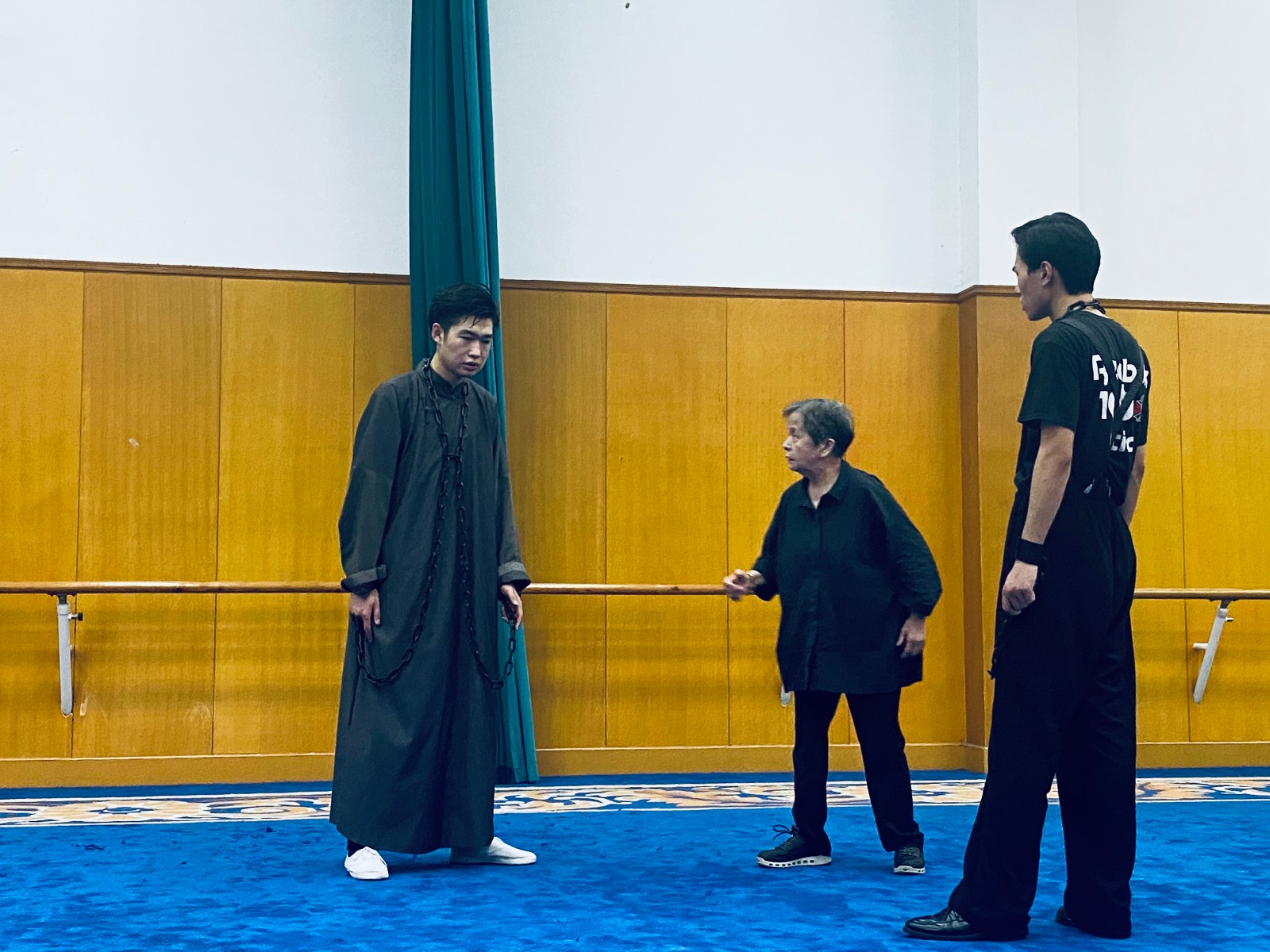 ▲著名戏曲导演杨小青为传承版越剧《红色浪漫》演员说戏