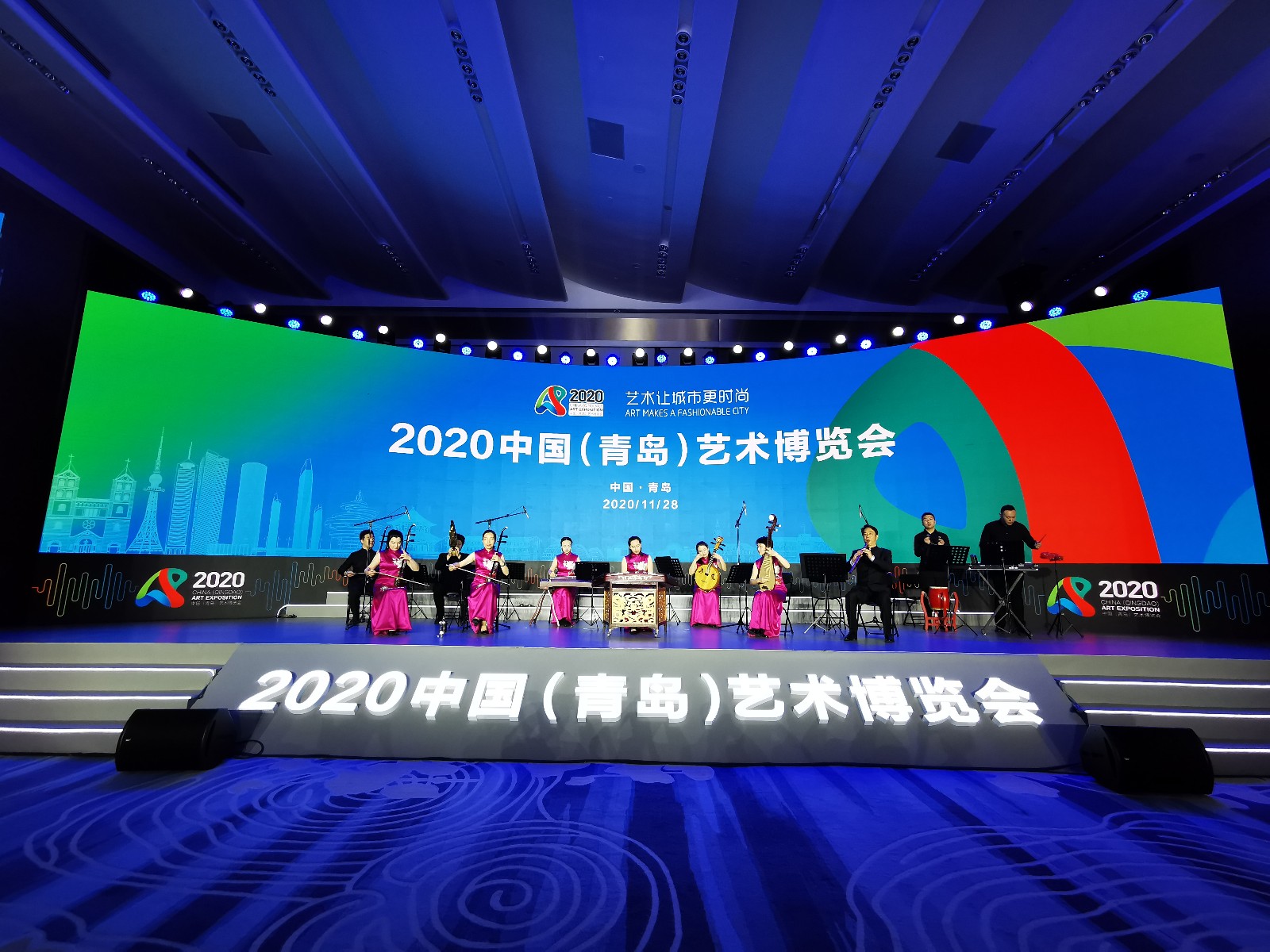 1128日上午,由中国艺术职业教育学会、中国职业技术教育学会主办的2020中国(青岛)艺术博览会在青岛国际艺术中心开幕,现场举办了一场小而美的音乐会。音乐会由国内知名音乐院校师生联袂演出。因为防疫需要,本届艺博会压缩精选了音乐会内容,全场演出三首曲目:首位登场的是中央音乐学院青年小提琴演奏家劳黎,带来了小提琴曲《阳光照耀塔什库尔干》;第二个节目是我校“江南丝竹音乐演奏团”的江南丝竹音乐《小霓裳》,压轴节目是中国艺术职业教育学会副会长、著名胡琴演奏家、中国音乐学院教授沈诚带来的板胡独奏《月牙五更》。
