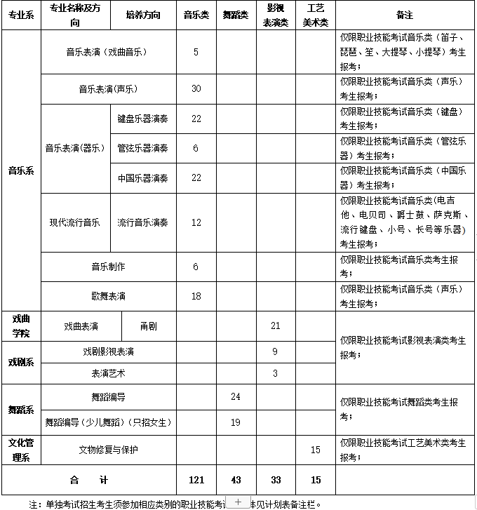3.音乐表演(戏曲音乐)综合成绩=(职业技能考试成绩/3×0.5+专业加试成绩×0.5)×0.7+文化考试成绩/3×0.3;