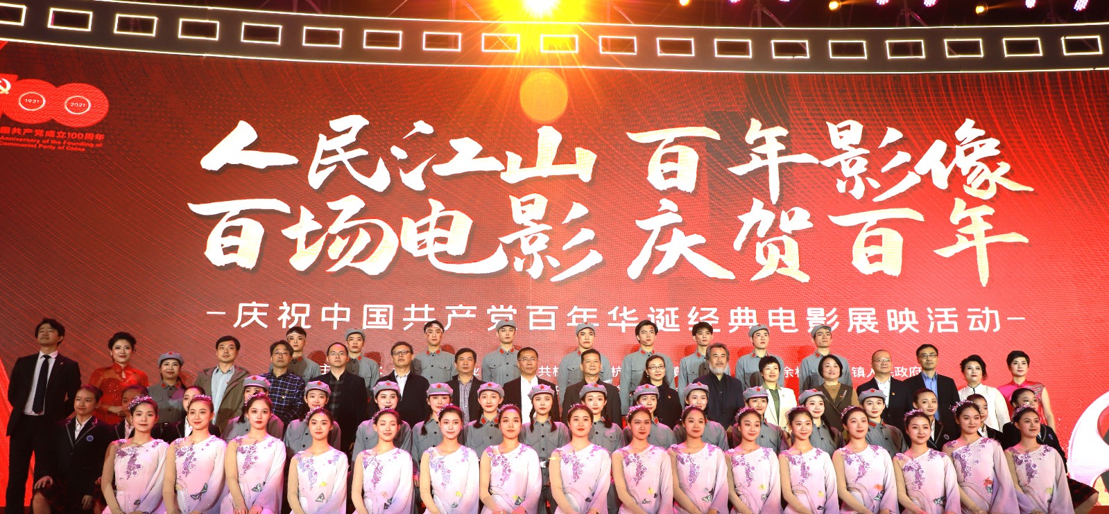 启动活动中,浙艺师生为现场观众奉献了一台精彩而又充满正能量的文艺演出。演出在浙艺同学们深情而激昂的合唱声中拉开帷幕,《妈妈教我一支歌》唱出了中华民族伟大复兴磅礴力量的来源,也唱出了新一代青年铭记中国共产党的丰功伟绩,和对不屈不挠的奋斗精神的深刻理解和传承。由浙江省朗诵协会会长刘忠虎和杨莅共同朗诵的诗词《红船,红船》,抑扬顿挫的深情朗诵读出了中国革命红船启航地浙江人的骄傲,小小的红船见证了开天辟地的大事变,中国共产党由此诞生,并开启了跨世纪的伟大航程。由浙艺戏曲学院副院长周伟君演唱的越剧新唱《七律·长征》则一改传统越剧温柔婉转的气质,唱出了中国共产党和中国工农红军克服艰难险阻到达陕北的战斗豪情。诗朗诵《卜算子·咏梅》《七律·人民解放军占领南京》,越剧新唱《为女民兵题照》,男女二重唱《不忘初心》等节目精彩呈现,表演者精神饱满,无论是朗诵、越剧还是歌唱,每一个节目都饱含深情,极富感染力,师生们用自己精深的艺术造诣讴歌了中国共产党成立百年来的伟大历程和不朽精神。演出结束后,瓶窑老街电影院、内十里渠水街和浙江艺术职业学院多地同时联动播放百场影展的开幕影片《建党伟业》,现场观众通过影片回顾了毛泽东、李大钊、陈独秀、周恩来等第一批中国共产党员在风雨飘摇的时代为国家赴汤蹈火的精彩故事。