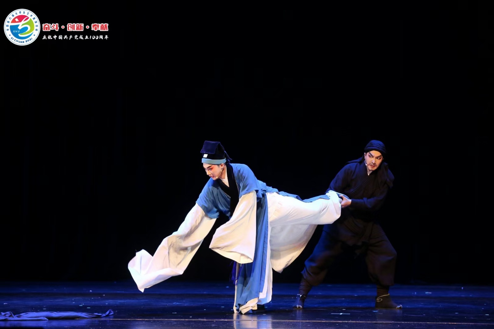 戏曲节目《珍珠塔·失塔》这一折戏中有大量跌扑动作,对舞台标准有特殊要求。展演现场舞台地面没有铺设地毯,不能满足戏曲节目演出条件,只能借助松香、酒精胶等黏性材料帮助演员粘鞋底,以求增大摩擦力,起到防滑作用。展演舞台上,两位演员全情投入,主演郑森化同学尽最大努力调整重心避免摔倒,然而在演绎雪天打斗的情节中,为了完成高难度技巧,郑森化同学全力表现跌扑动作,脚下打滑,以左脸着地的姿势重重地摔在了坚硬的舞台地板上,当场晕厥。助演高清同学敏锐地察觉到搭档的异常,随机应变,因地施策,在剧情逻辑中巧妙地表演推搡动作,几次用力地推同伴,终于将郑森化推醒。此时,刚刚从晕厥中被推醒的郑森化凭借坚强的意志力继续演出,最终高水平完成了整场戏,收获了现场不绝的掌声。