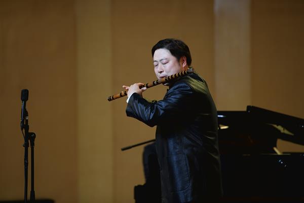 我校音乐系竹笛专业教师常轶伟带来了一首充满西域风情的《胡旋舞》。该曲由台湾作曲家钟耀光作曲,原是一首西洋长笛曲2010年经中央音乐学院博士生导师戴亚教授改编后作为当年台北笛子大赛决赛规定曲目,是目前笛曲中技术难度较大的作品。作为浙艺音乐系民乐教研室青年教师代表的常轶伟,自2020年荣获“新松计划”浙江省青年演奏员大赛吹奏组一等奖后,此番再度亮相舞台,带来了精彩纷呈的出色演绎。