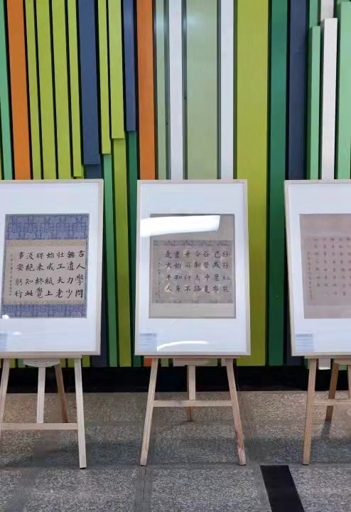 而在书法模块中,除了作品《风住尘香》以宋朝著名女词人李清照的《武陵春·春晚》为临摹范本,其余27幅作品内容均以南宋时期诗人词人们所作的诗词为范本临摹而成。同学们经过反复的练习,选择自己最擅长的字体,自成格调,将最完美的作品呈现给参观者。