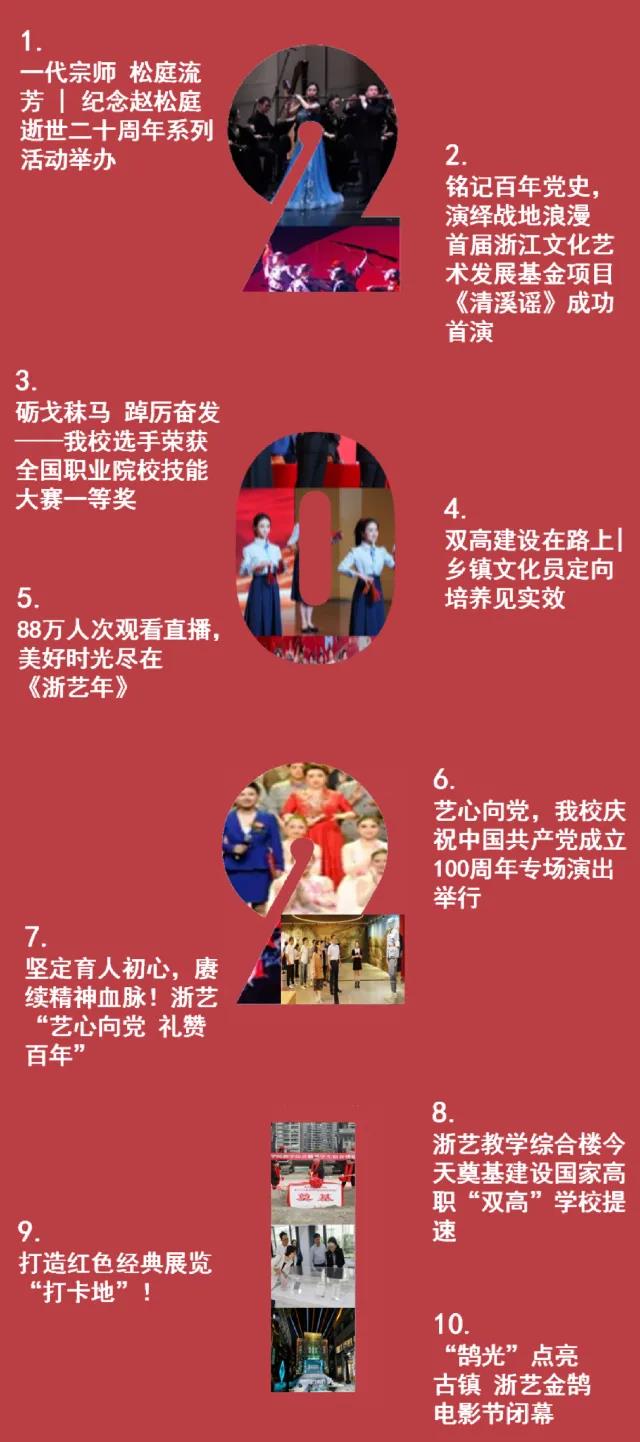 近期,浙江艺术职业学院启动2021年度十大新闻评选工作,经过初选、师生校友网络投票,浙江艺术职业学院2021年度十大新闻评选结果发布。快来看浙艺人的2021年!