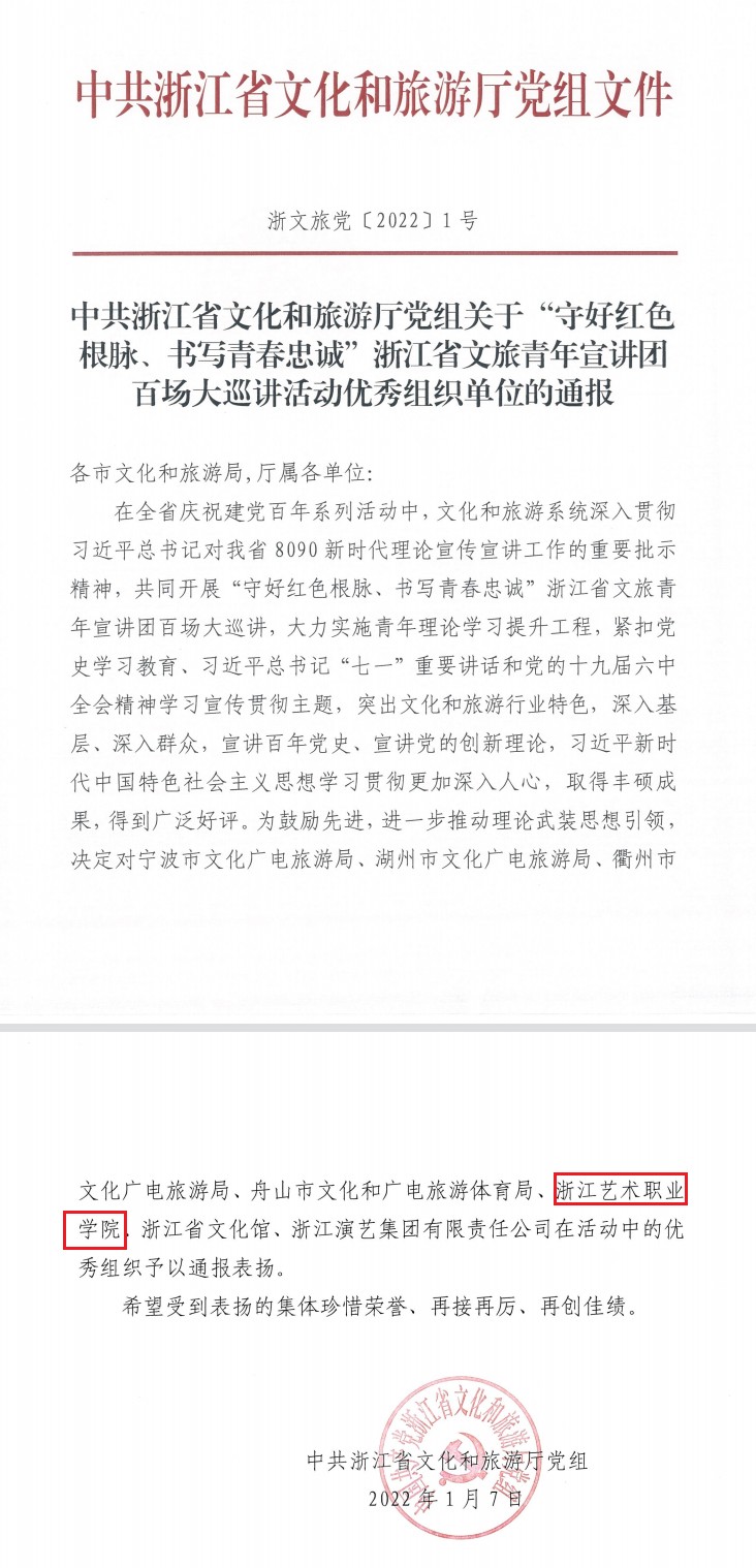 近日,浙江省文化和旅游厅发布《关于对2021年浙江省文旅青年宣讲团百场大巡讲活动优秀组织单位予以表扬的通知》,浙江艺术职业学院被评为优秀组织单位。