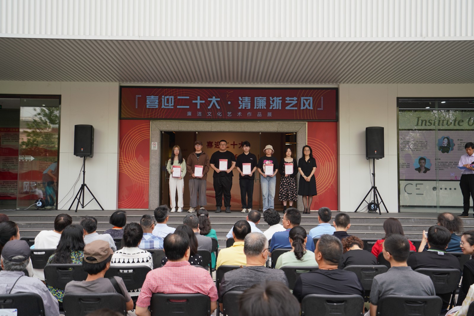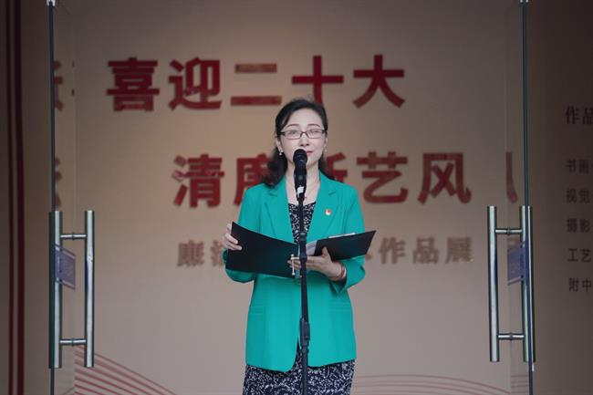 黄杭娟在致辞中表示,作为学校迎接党的二十大主题宣传教育系列活动之一,此次展览立足艺术特色,以多种作品形式呈现“守初心、知敬畏、扬正气、担使命”的廉洁主题,充分展示了学校紧紧围绕“立德树人”的根本任务,坚持营造风清气正的校园氛围,坚持培育师生敬廉崇洁、清正自律的价值观念。希望通过艺术的形式,引导广大党员、师生追求高尚的职业道德和个人情操,树立良好的校风学风,规范师德师风,营造涵养校园清廉文化,为持续提升清廉学校建设水平,推动学校“十四五”高质量发展和助力“双高”建设筑牢思想根基,做到德才并重。全校师生要将新时代廉洁文化内化于心、外化于行,牢固树立正确的世界观、价值观、事业观,明大德、守公德、严私德,以坚实的担当和优异成绩迎接党的二十大胜利召开。