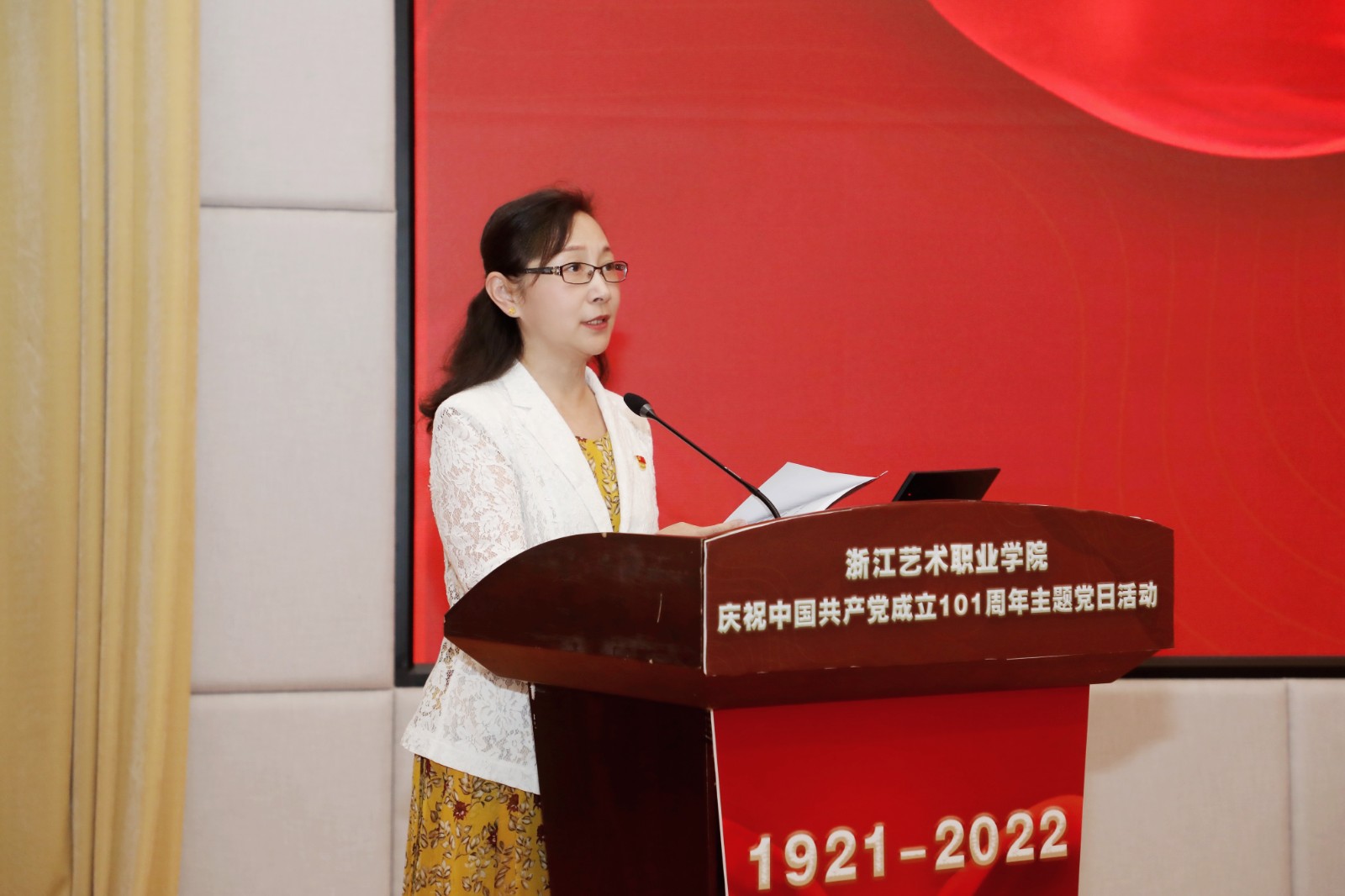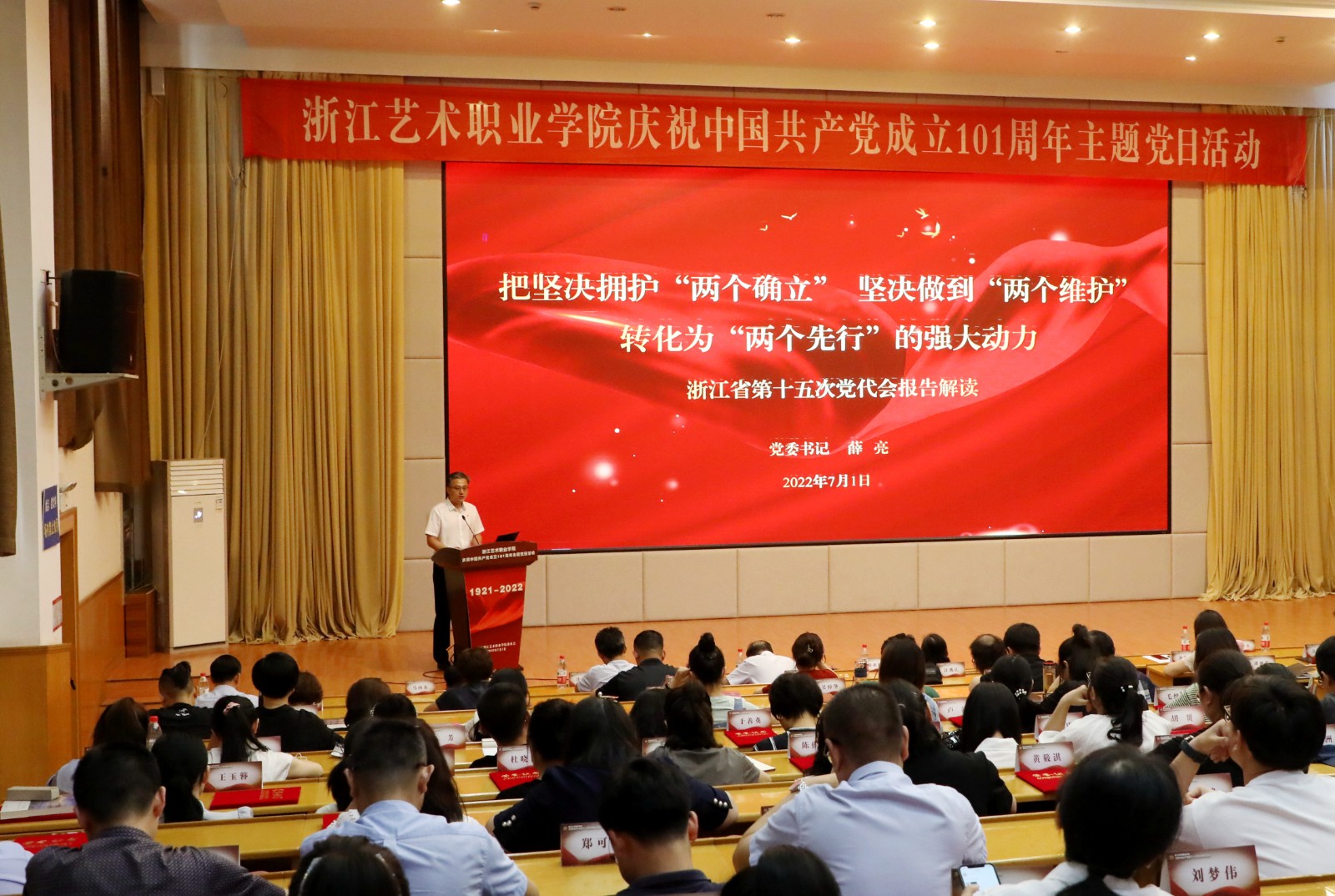 为庆祝中国共产党成立101周年,回顾党的光辉历程,讴歌党的丰功伟绩,赓续红色血脉,浙江艺术职业学院在学校图信报告厅隆重举行庆祝中国共产党成立101周年主题党日活动。校党委班子成员,各党总支、直属党支部书记、副书记,全体中层干部、主管岗位人员,基层党支部书记、组织员和师生党员代表、学校“两优一先”受表彰对象、2022年发展的新党员代表参加活动。校党委书记薛亮作省十五次党代会精神宣讲,院长、党委副书记黄杭娟宣读表彰名单,校党委副书记夏开堂主持活动。