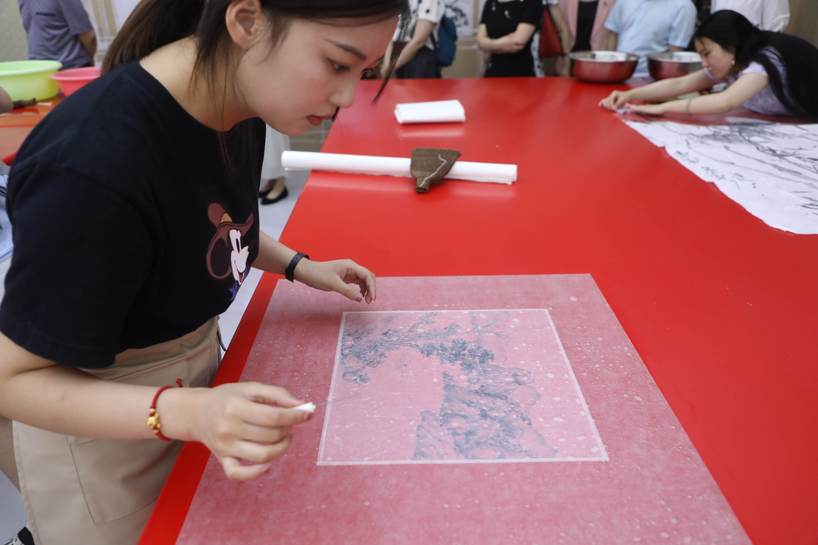 ▲“富阳竹纸制作技艺”省级非遗传承人带领浙艺师生体验“抄纸”技艺
