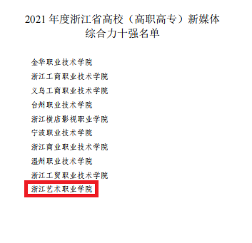 近日,浙江省教育厅新闻办公室、浙江教育报刊总社公布了2021年度浙江省优秀教育新媒体评选活动结果,浙江艺术职业学院荣获浙江省高校(高职高专)新媒体综合力十强。