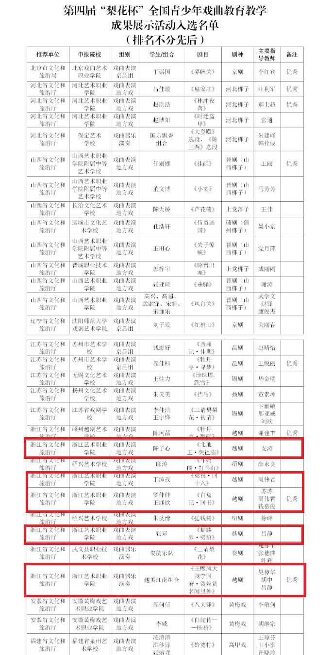 近日,第四届“梨花杯”全国青少年戏曲教育教学成果展示活动入选名单(学生展示项目)公示,浙江艺术职业学院共有5个节目入围,入围数量位列全省第一。浙江省共有9个节目入围,入围数量位列全国第一(各省(区、市)文化和旅游厅(局)推荐通道)。