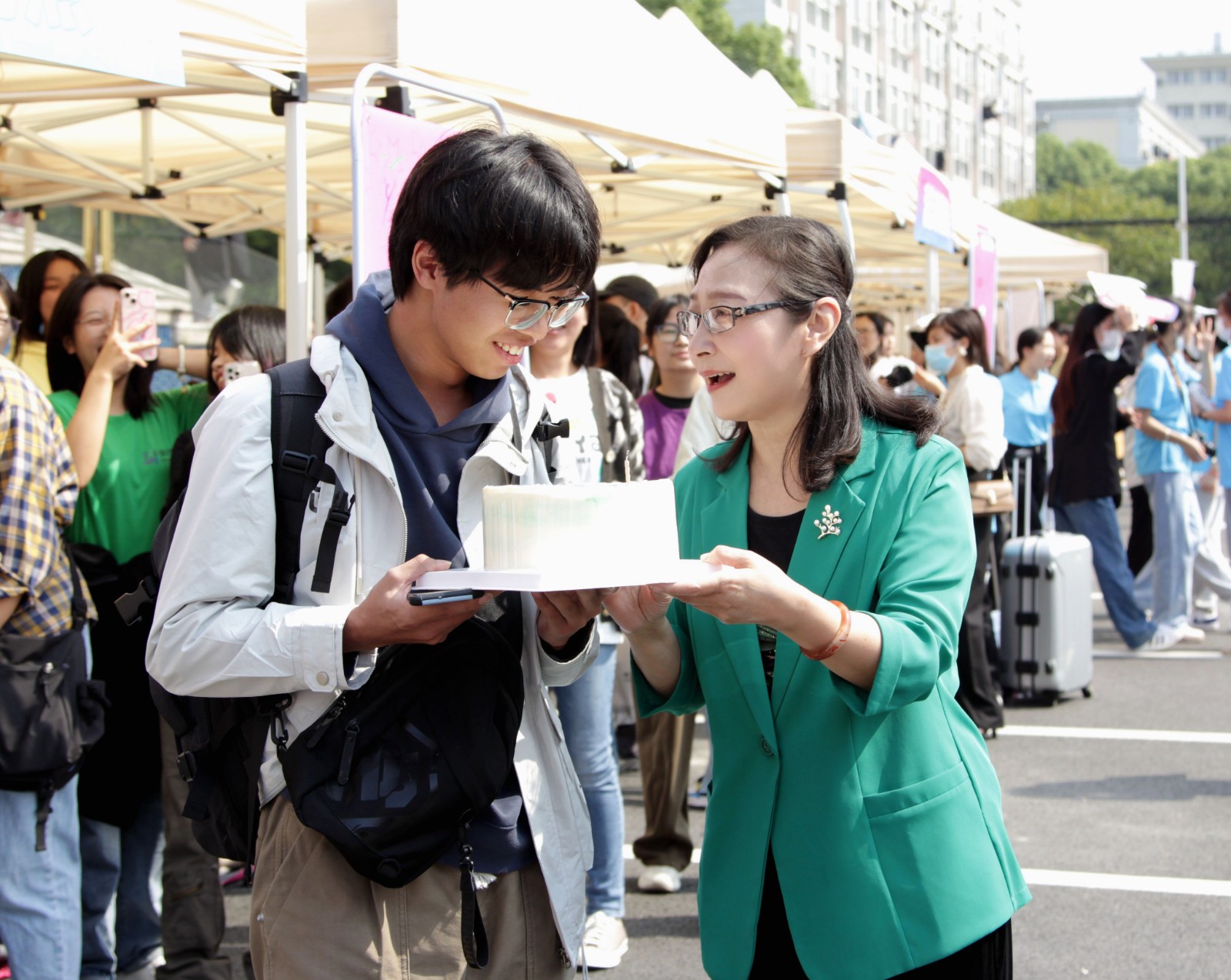 学校为报到当天生日的新同学准备了生日庆祝活动,校领导为新生递上生日蛋糕,送上生日祝福。志愿者们拿着话筒,跟着音乐节奏为“寿星”唱起生日歌,现场暖心满满。戏剧影视学院2022级影视编导班的李熠恬是当天生日新生中的一员。“这个惊喜来得在我意料之外,非常开心,非常感谢学校精心准备的生日庆祝活动。”李熠恬说道。