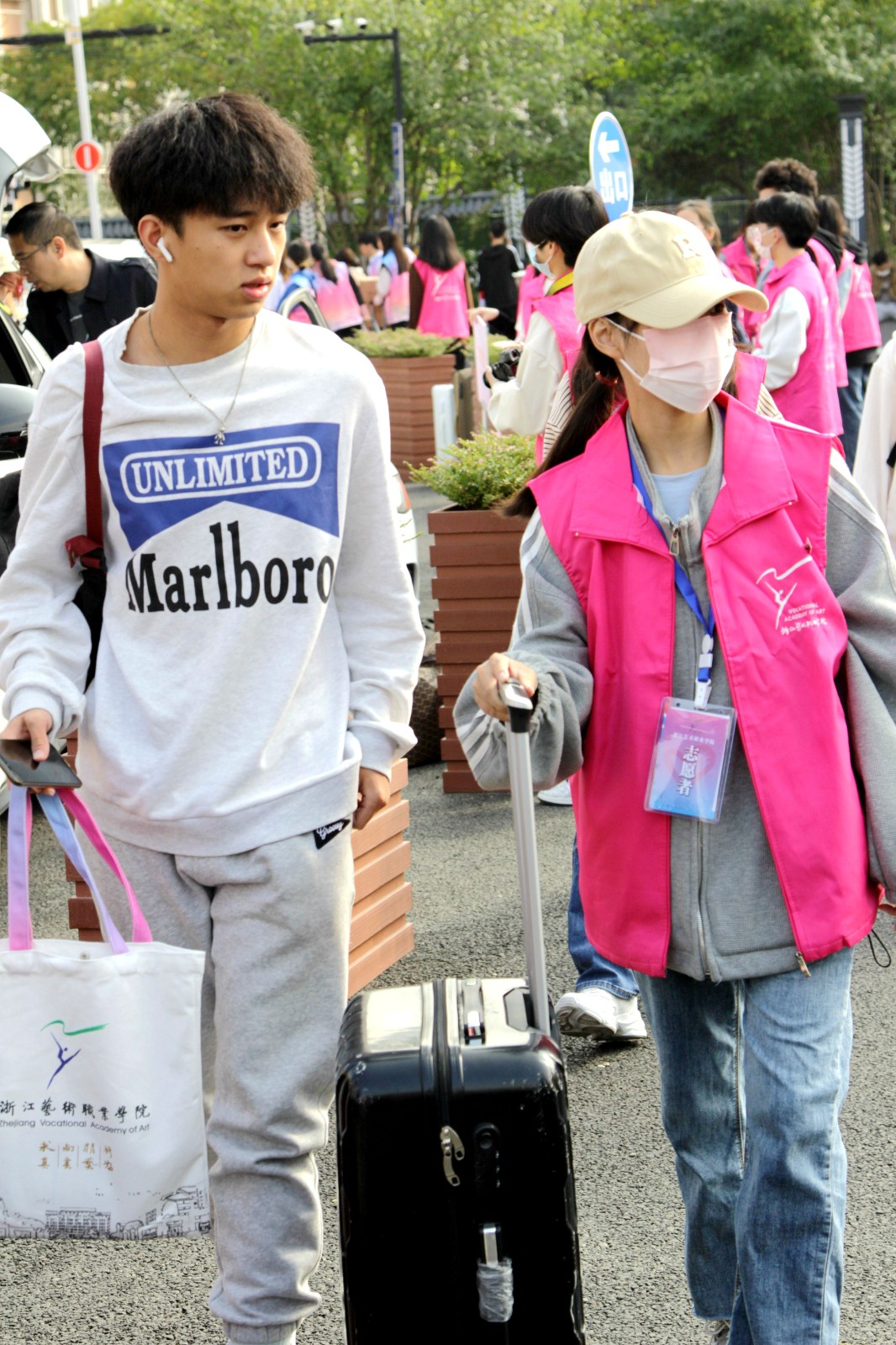浙江实验艺术剧场广场上非常热闹,播放校歌、志愿者引导、搬运行李……报到气氛热烈。领取新生大礼包、验证录取通知书、户口办理、学平险办理……各二级学院都设置了报到点和行李寄存点,为新生提供相应服务。