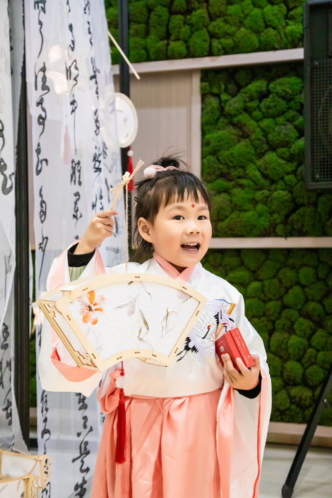 走进浙艺学的宋韵亲子游园会的现场,大厅中庭布置了经典宋画《千里江山图》《女孝经图》,书法纱幔、植物标本灯笼,古韵音乐伴随着游园活动流淌开来。“开笔礼”、点红仪式、“作揖礼”带领小朋友们开启宋韵世界。家长们表示,这场活动主题好、寓意深,让少年儿童从内心深处认同和喜爱我们的传统文化。