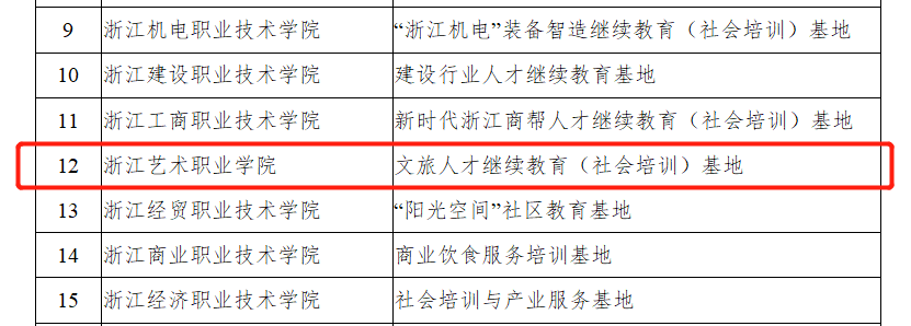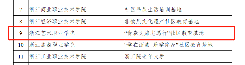为构建服务全民终身学习体系,推进终身教育高质量发展,12月21日,浙江省教育厅公布2022年度浙江省服务终身学习相关项目遴选认定结果,浙江艺术职业学院申报的两个项目成功入选,其中文旅人才继续教育(社会培训)基地入选浙江省示范性继续教育(社会培训)基地,“青春文旅志愿行”社区教育基地入选浙江省社区教育示范基地。