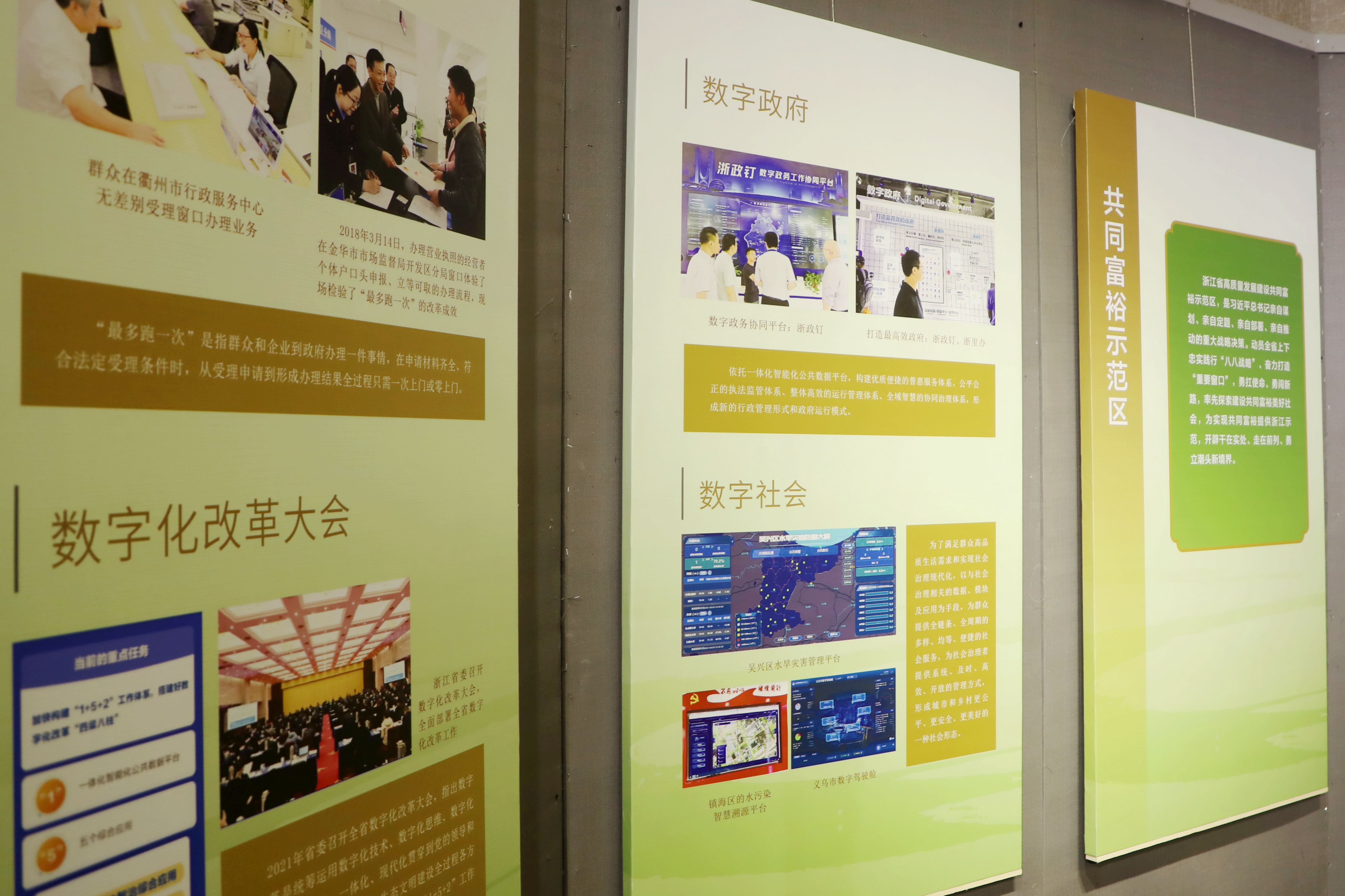 展览分为四个部分:“革命火种在“浙”里燃起(1921—1949)、新中国在“浙”里见证(1949—1978)、改革开放“浙”里先行(1978—2002)、新征程“浙”里谱写新篇章(2002至今)”。从1921年中国共产党在嘉兴南湖诞生,到“四千精神”开启浙江改革开放之门,再到“八八战略”“绿水青山就是金山银山”等重要决策、重要思想论述的产生和发展过程。突出展现浙江作为中国革命红船起航地、改革开放先行地、习近平新时代中国特色社会主义思想重要萌发地在百年党史中的重要地位。