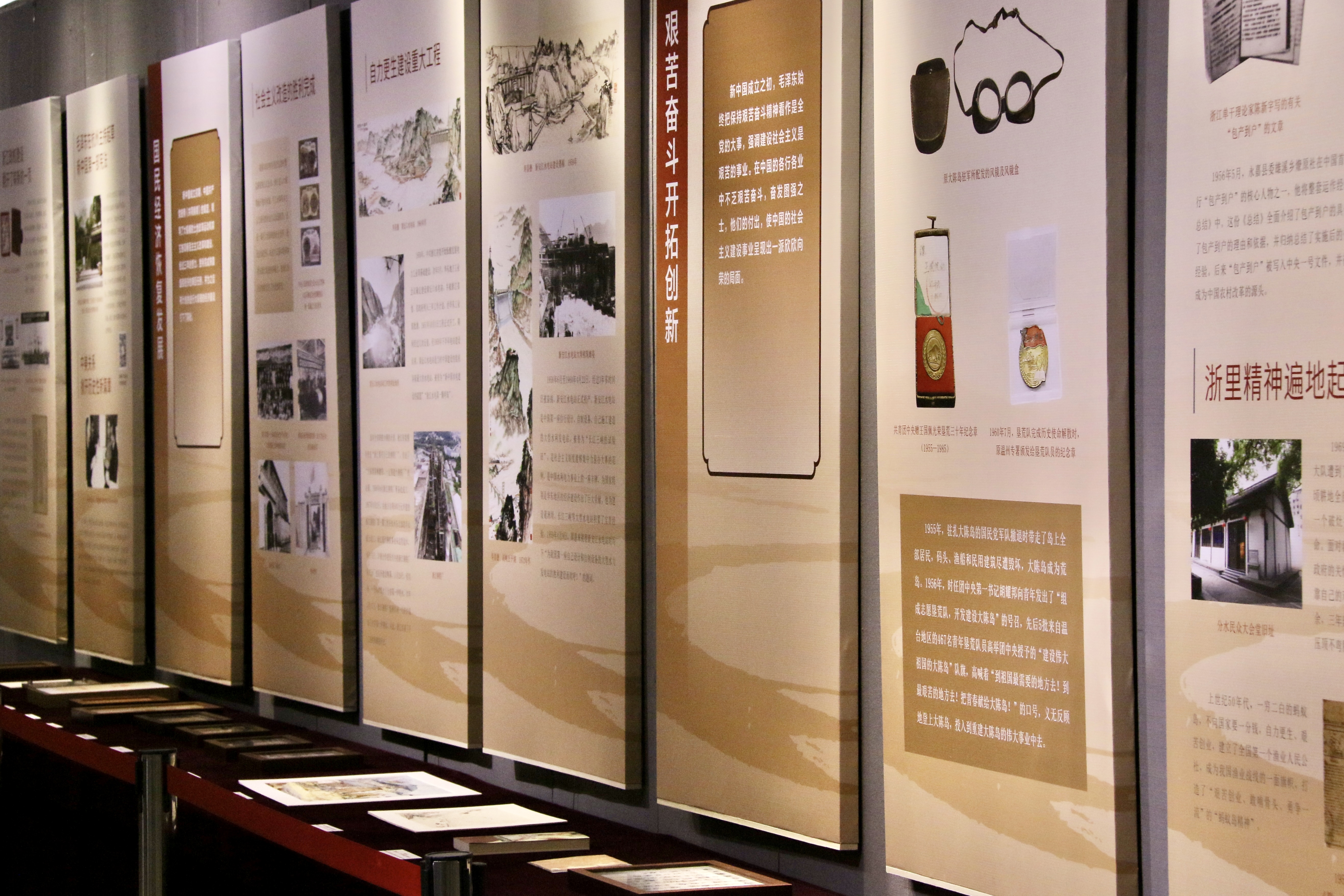 展览首先通过《浙江新潮》等革命文献文物,以“扬帆起航、冲破迷雾、劈波斩浪、红旗潮涌”为单元,阐述了中国共产党从初创至崛起的历史;同时回顾新中国成立后“政权在杭立宪”“恢复发展国民经济”“艰苦奋斗开拓创新”的史实,以“中美建交”“三大改造”等国际国内措施,体现浙江在重大决策面前的伟大实践;随后聚焦“实践检验真理标准、对内改革浙江经验、对外开放贸易强者、科教兴国产业集群”四个板块,陈列《人民日报》《解放日报》等革命文献史料,强有力地证明了浙江始终走在党中央重大决策第一线;最后着重“绿色发展美丽浙江”“文化赋能城乡一体”等新时代战略,以“五水共治”“打造文化精品”等多项落地工程展示浙江如何有力推动高质量发展。
