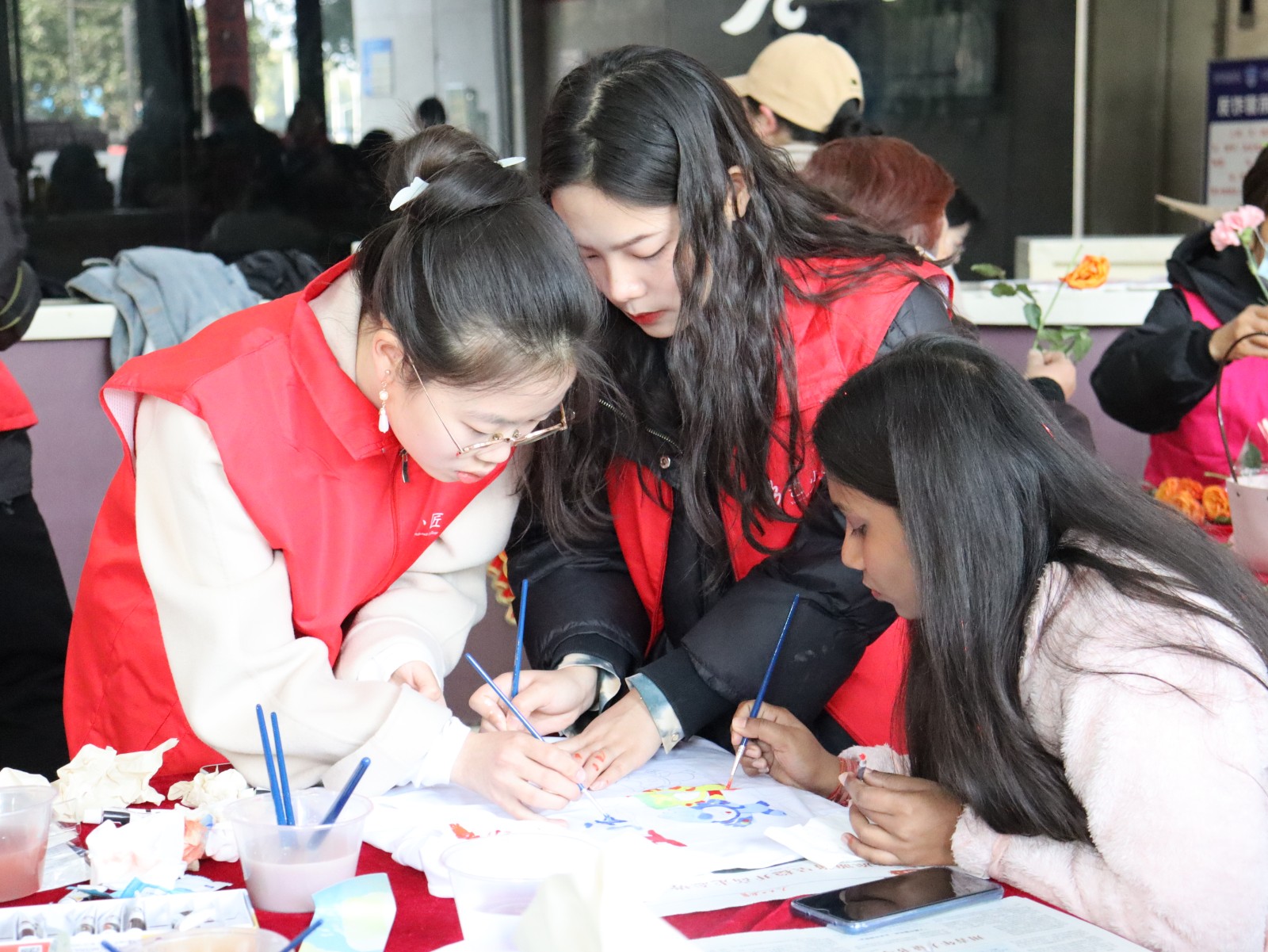 在“巾帼绘亚运”创意彩绘T恤活动中,外国友人们神情专注,精心在衣服上进行彩绘。