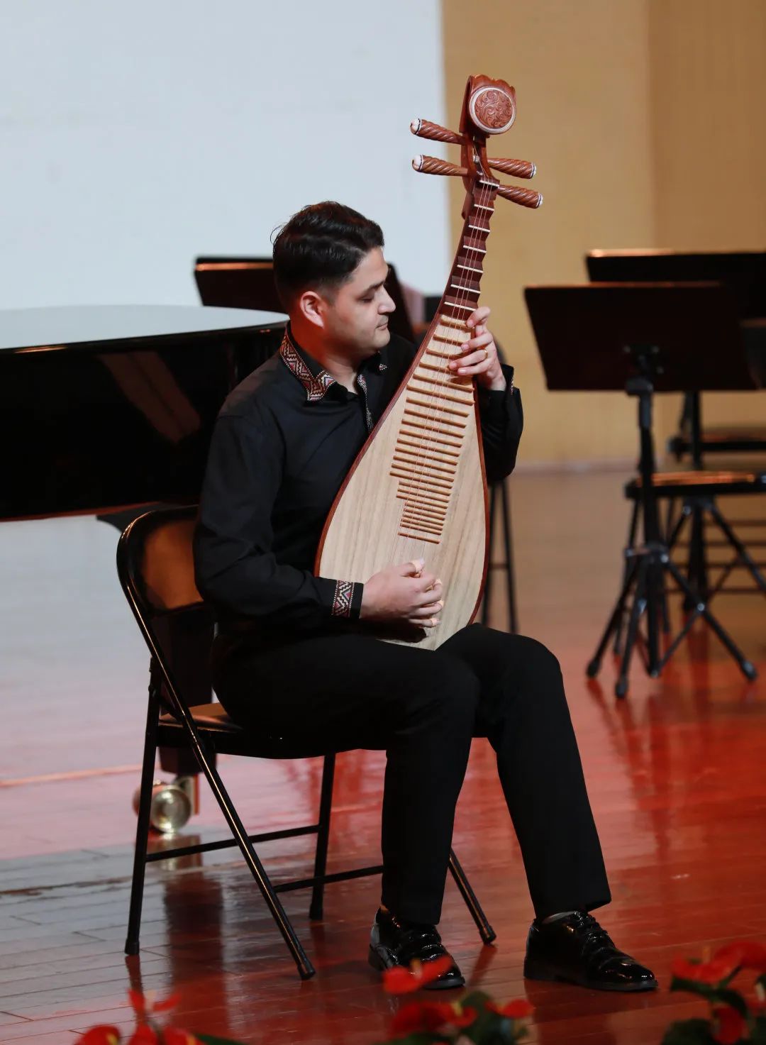 让人眼前一亮的是西尔扎提江在浙艺学习琵琶的汇报之作,他邀请音乐学院教师田甜、熊壮壮与他共同演绎。刚接触琵琶时,西尔扎提江觉得琵琶太难学了,右手的指法繁多,左手还有各种润音技巧。但是慢慢学,慢慢练,在音乐会上精彩呈现了《茉莉花》《晴雯歌》《我和我的祖国》三首乐曲。