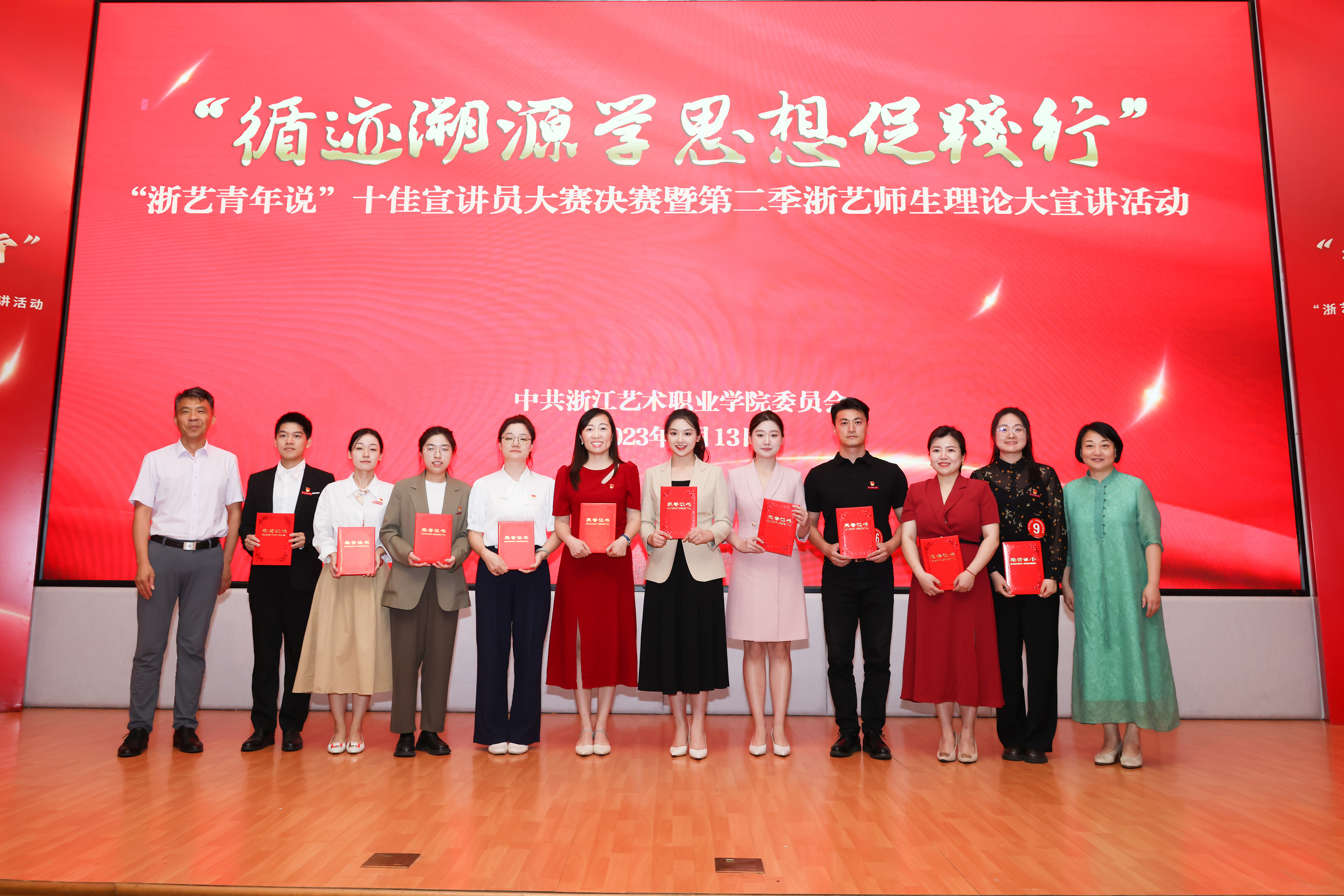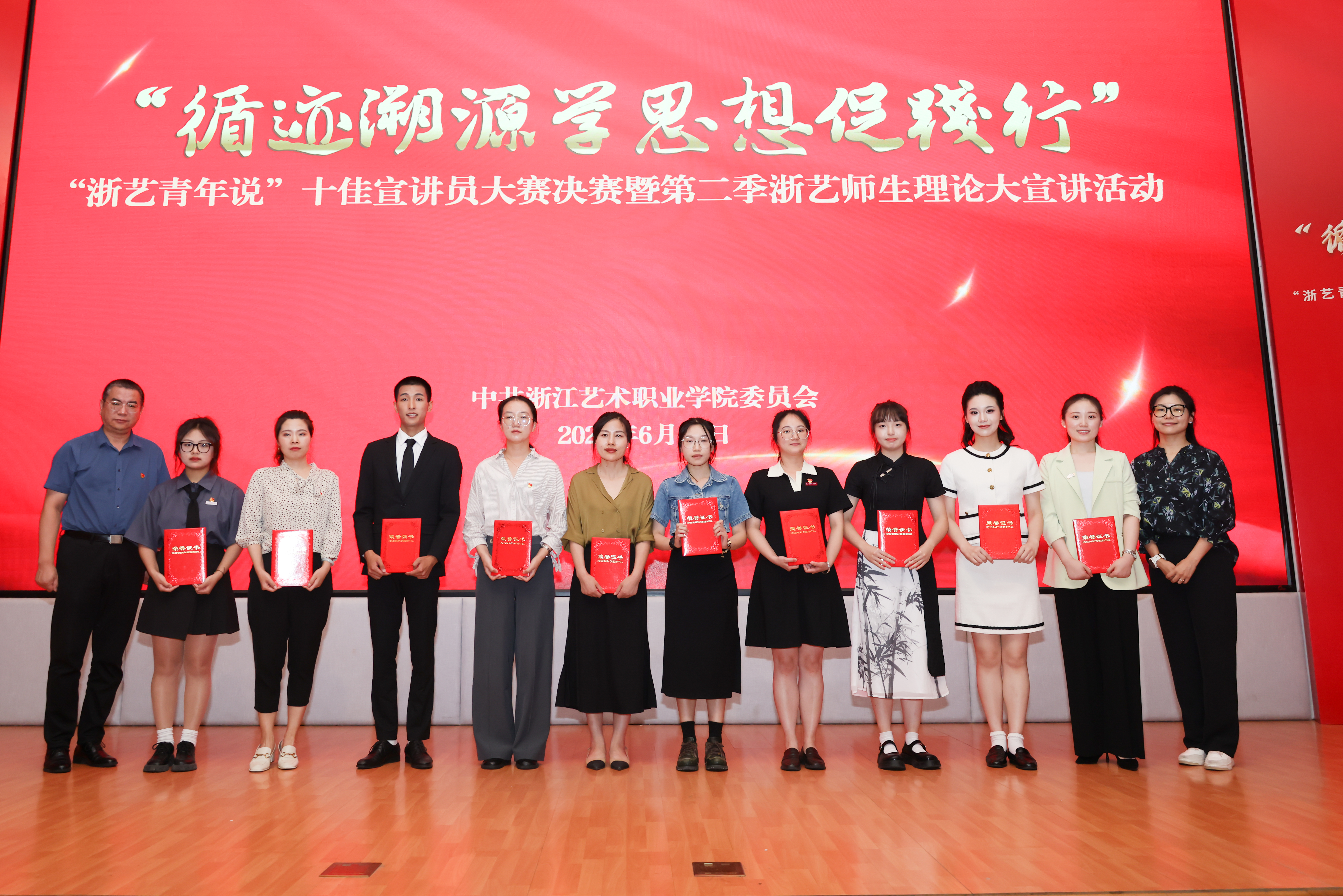 校党委委员、副院长沈军甫,党委委员、副院长支涛为“浙艺青年说”十佳宣讲员称号获得者颁奖