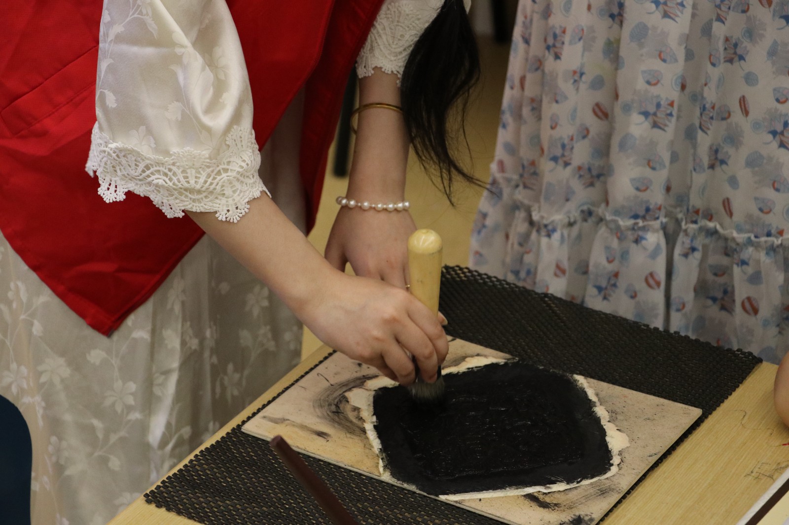 在水印木刻体验中,“艺小匠”详细讲解了水印木刻的印制流程及印制工具。在“艺小匠”的指导下,参与体验的小朋友们将蘸取墨水的刷子在木板上刷色,均匀涂抹版面,观察好版面的位置后把宣纸对准印版平铺,借助马莲来回旋转按压,使纸面和版面上的墨充分接触。