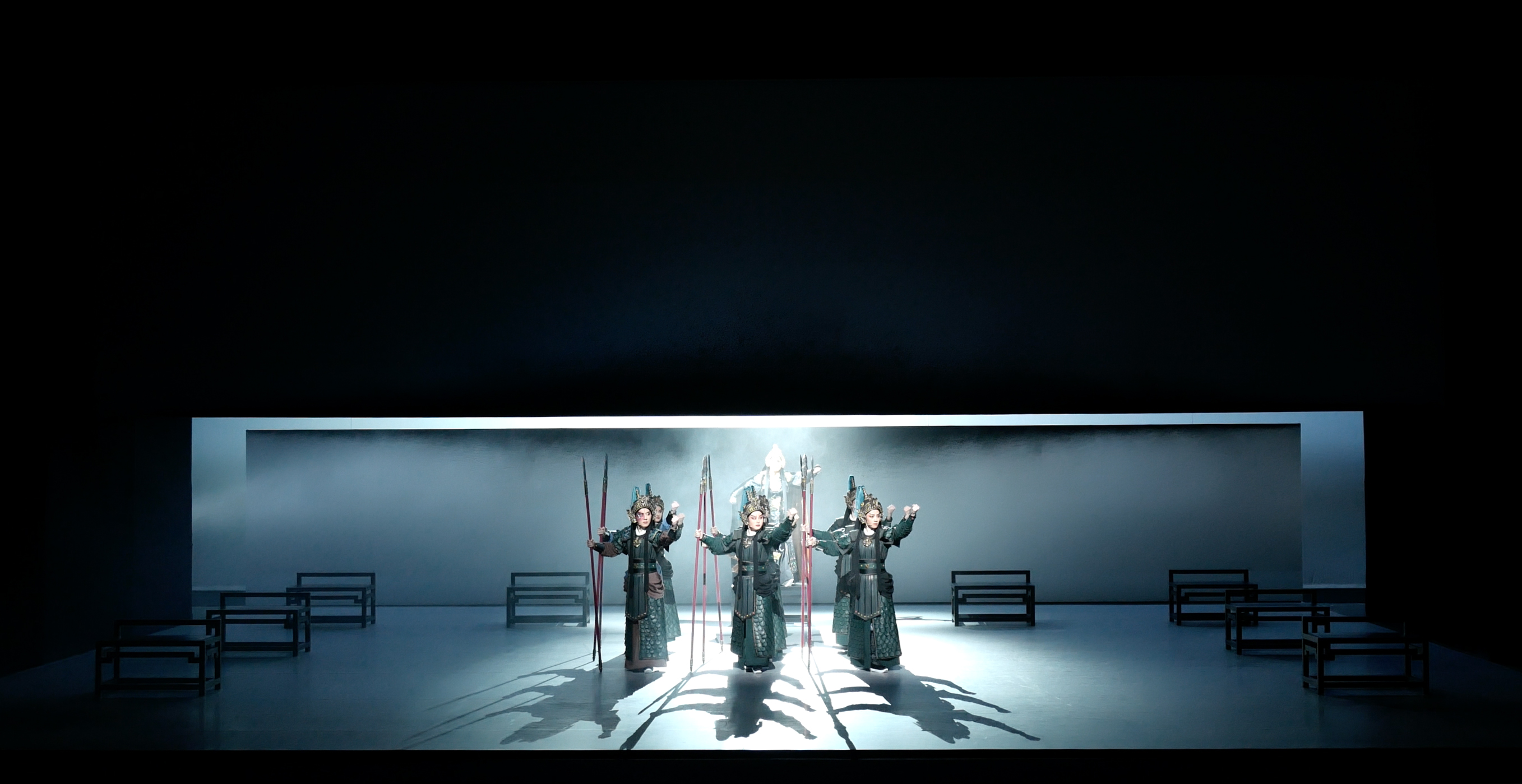 周正平一直对于艺术创作有独特的见解,被中国艺术界誉为“灯光诗人”。本次展览中,周正平的作品有越剧《红玉》和山水剧场《清溪江湖》。《红玉》的灯光设计融入舞美整体空间的韵律,又作为流动的画笔自成体系。在白色调的空灵布景中,使用和谐的色彩和精致的笔触,描绘出简约诗化的情境。在创造意象空间的表现手法上,运用富有张力和节奏感的光影,既刻画了表演动作,又强化了全女班演员在武戏上的阳刚气质。将繁复的技术手段和凝练的艺术构思隐藏在诗意画面背后,通过光形成视觉语汇,与观众进行情绪对话。在《清溪江湖》中,周正平让视觉艺术进入清湖古镇的整体公共空间,既是对沉睡着的江山文化的唤醒,也是他游走半生对故乡的献礼。