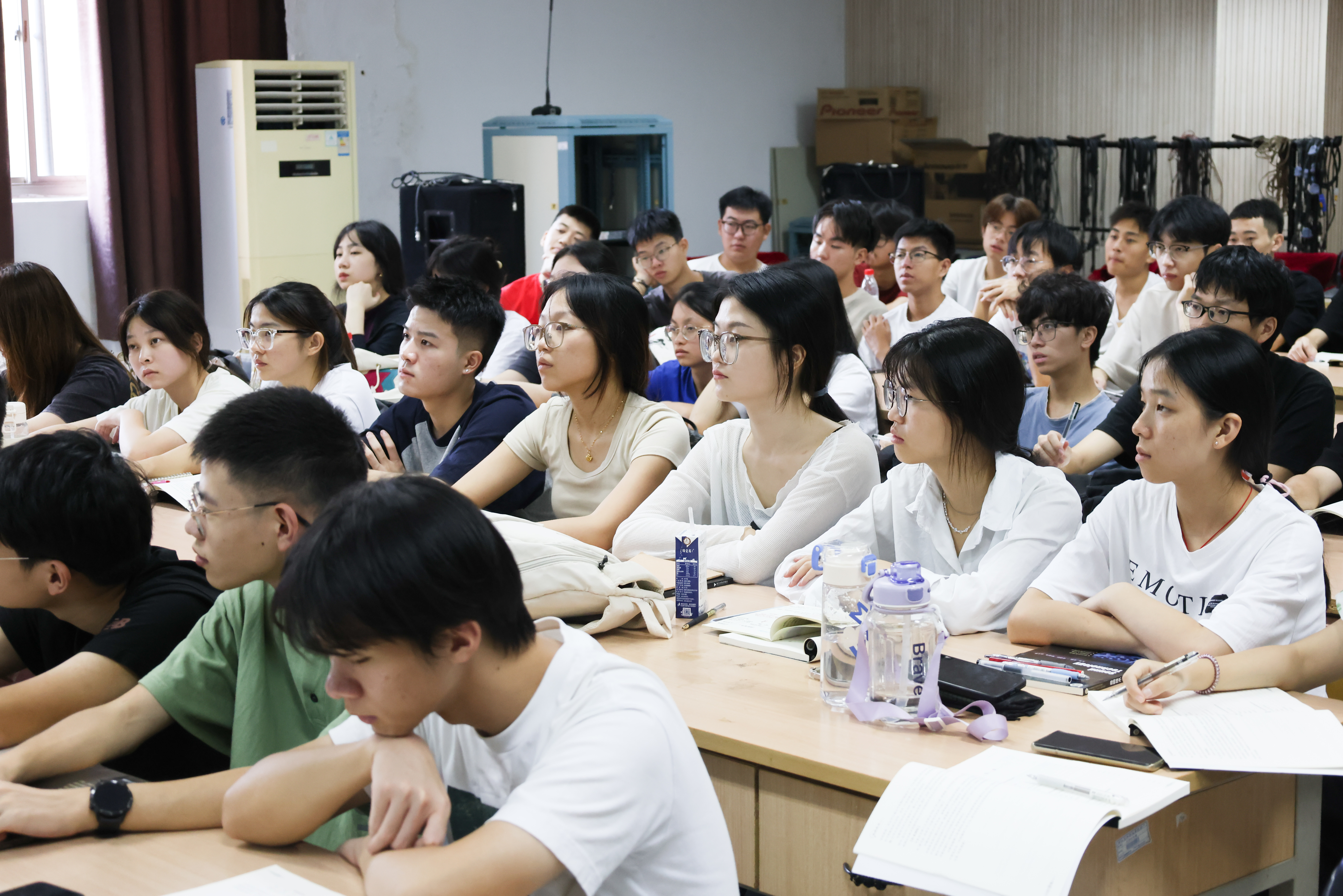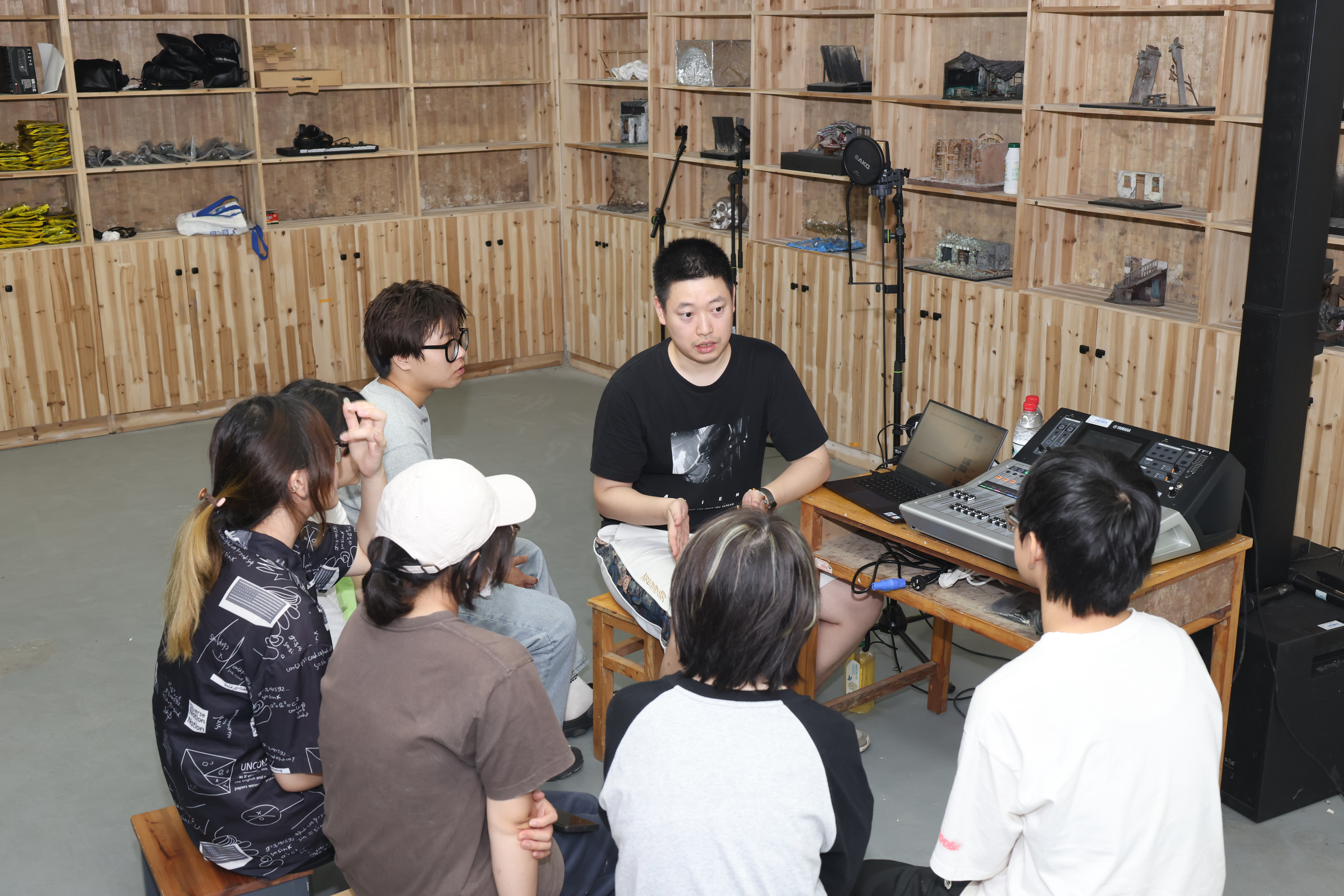 设计学院教师江腾皓面向2021级舞美专业(音响方向)学生所教授的课程是《音响实践与操作》,由于是小班课,学生数量少,学生围成一圈,耐心听老师讲解。江腾皓在课堂上作示范,利用音响发出的不同声音告诉学生如何辨别,讲解细致入微,学生认真做笔记。